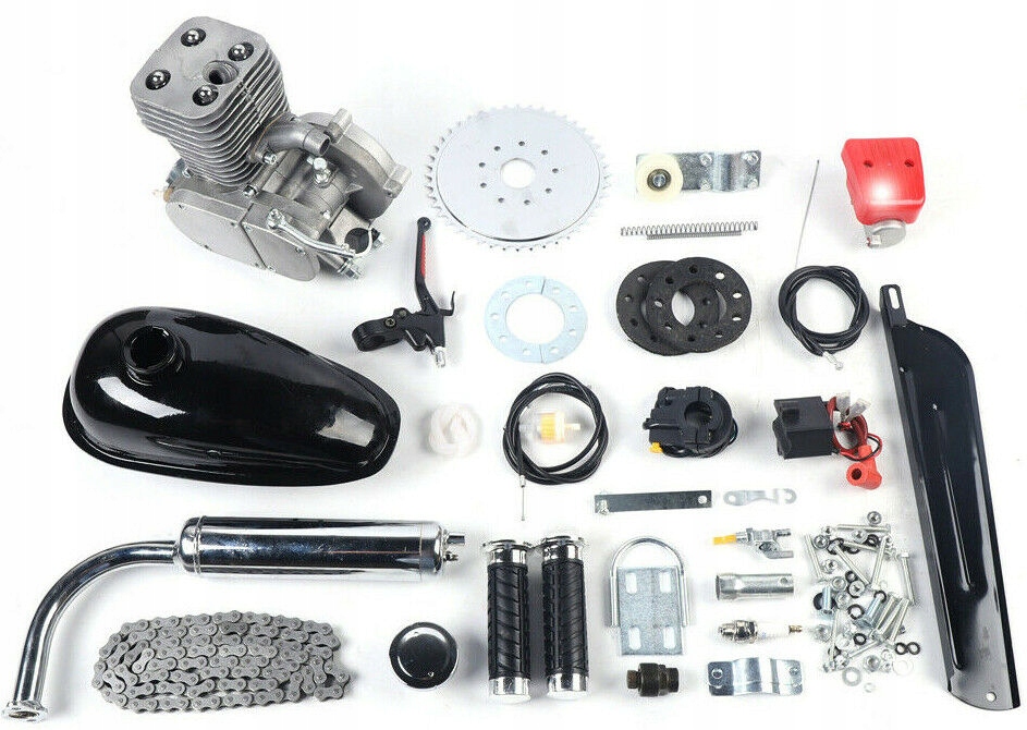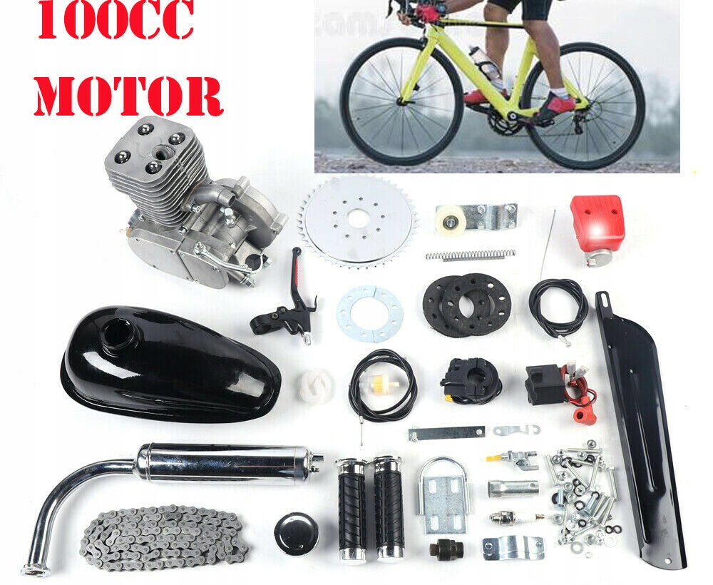 - · Комплект для мотоцикла объемом 100 куб.см включает в себя все детали и аксессуары, необходимые для превращения вашего обычного мотоцикла в мотоцикл с бензиновым двигателем.