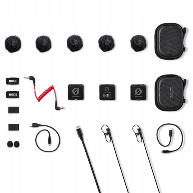 - Полное оборудование, включая чехол для зарядки, два микрофона Lavalier II, кабели, магнитные монтажные зажимы MagClip GO и футляр для аксессуаров.