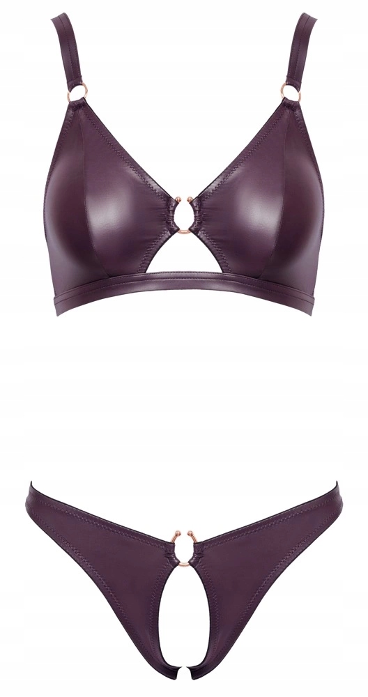 Характеристики продукта: Комплект: бюстгальтер + открытые трусики. Цвет: фиолетовый, мокрый вид. Материал: 90% полиэстер, 10% эластан. Регулируемые бретели Застежка на крючки и петельки сзади на бюстгальтере. Отделка из розового золота Размер: Л