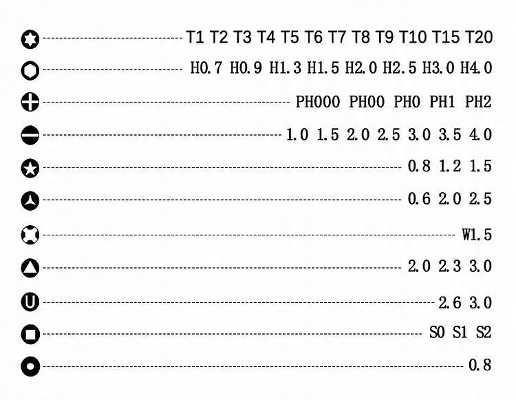 - 8 насадок Шестигранные ключи: H0 .7, H.0.9, H1.3, H1.5, H2.0, H2.5, H3.0, H4.0