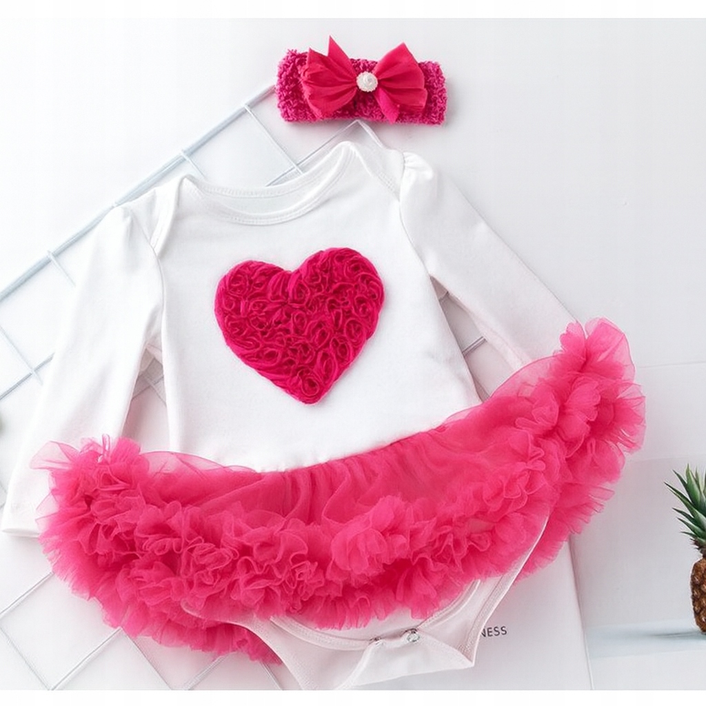 На передней части боди имеется аппликация в форме сердца, выполненная из нежных объемных роз ярко-розового цвета. Это романтический и девичий акцент, который придает всему комплекту неповторимый шарм. Нижняя часть боди декорирована пышной тюлевой юбкой, создающей эффект платья-пачки.