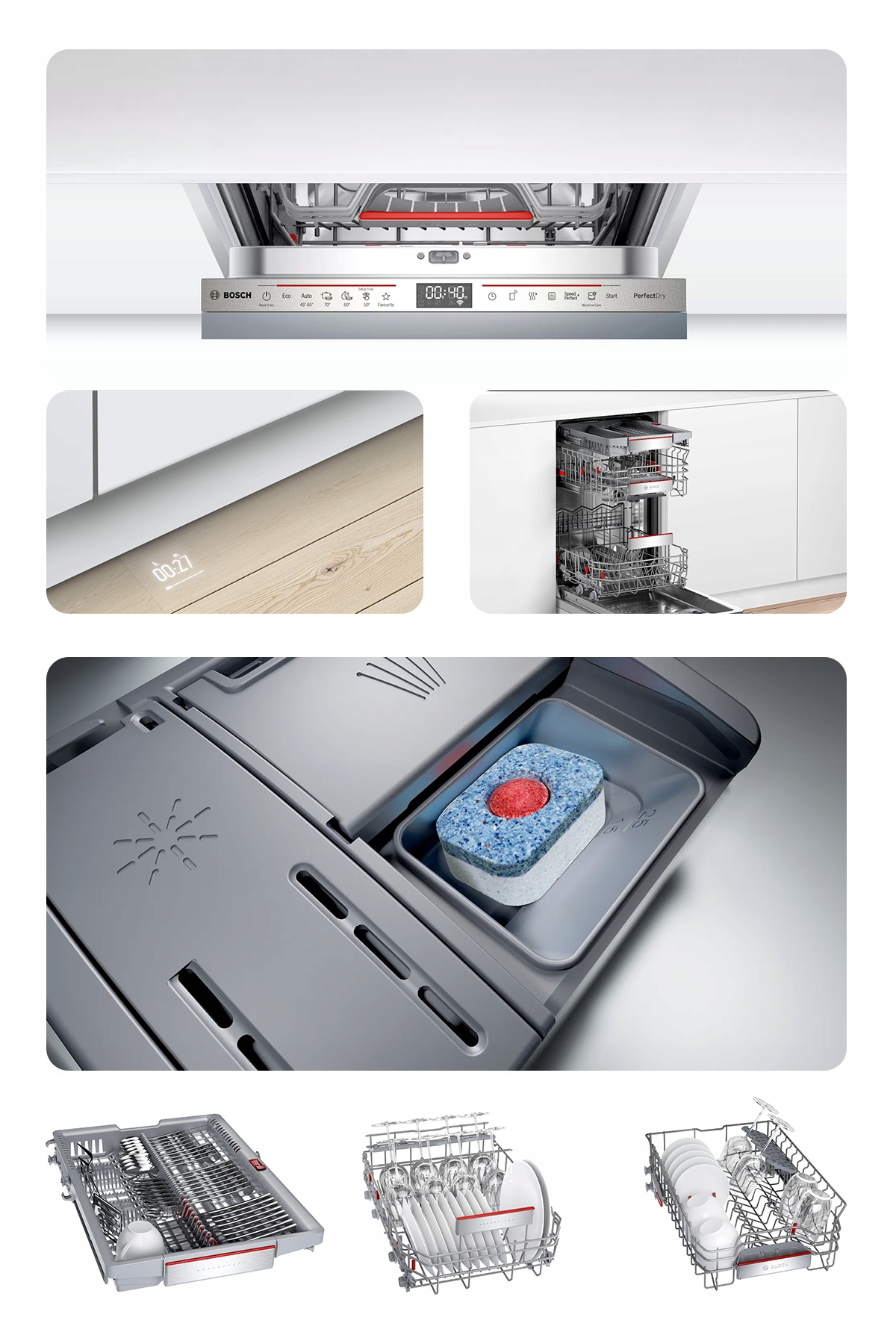 Иногда случается, что после мытья некоторая посуда (особенно пластиковая) остается влажной и требует дополнительной ручной протирки. Посудомоечные машины PerfectDry обеспечивают превосходные результаты сушки благодаря использованию цеолита – природного минерала, который впитывает влагу на этапе мытья и выделяет ее в виде теплого сухого воздуха во время сушки. Благодаря PerfectDry посуда попадает прямо в шкаф, а вы потребляете меньше энергии*. *Посудомоечная машина Bosch PerfectDry с технологией Zeolith® и классом энергопотребления B по сравнению с посудомоечной машиной Bosch без технологии Zeolith® и классом энергопотребления D.