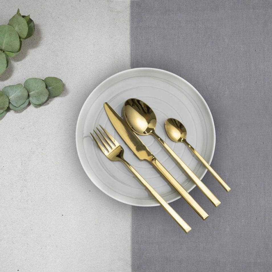 Набор золотых столовых приборов из серии Como, который поддерживается в минималистском стиле, состоящий из 24 элементов.