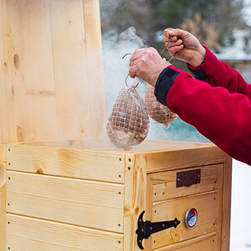 - · Высококачественные материалы - коптильная камера, изготовленная из еловой древесины, с удобным доступом через дверца и открывающаяся крыша размещены на устойчивом металлическом основании, что позволяет легко подсоединить камин из толстого печного листа.