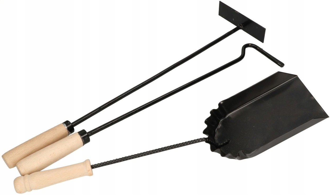 Набор изготовлен из толстого листового металла с черным порошковым покрытием и имеет деревянную ручку. Используется для угля, золы, рыси и т.п.
