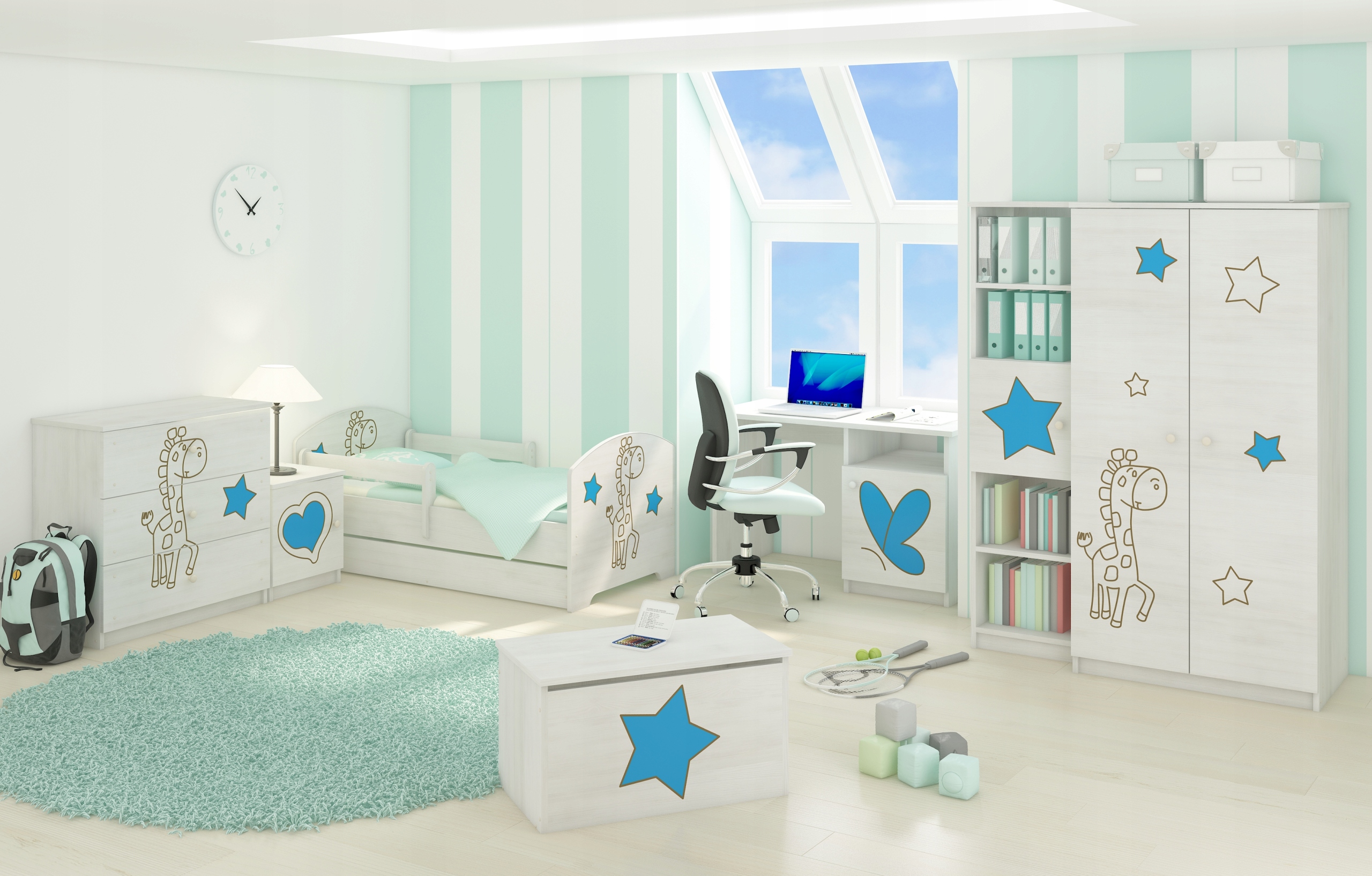 Комплект изготовлен из ДСП толщиной 16 мм. Гравированные элементы изготовлены из плит МДФ. Все принты на мебели выполнены экологическими красками, полностью безопасными для детей. Отпечатки имеют приятные, яркие цвета, защищенные специальным ламинатом, предотвращающим выцветание и истирание. Его можно смело стирать тряпкой и жидкостью.