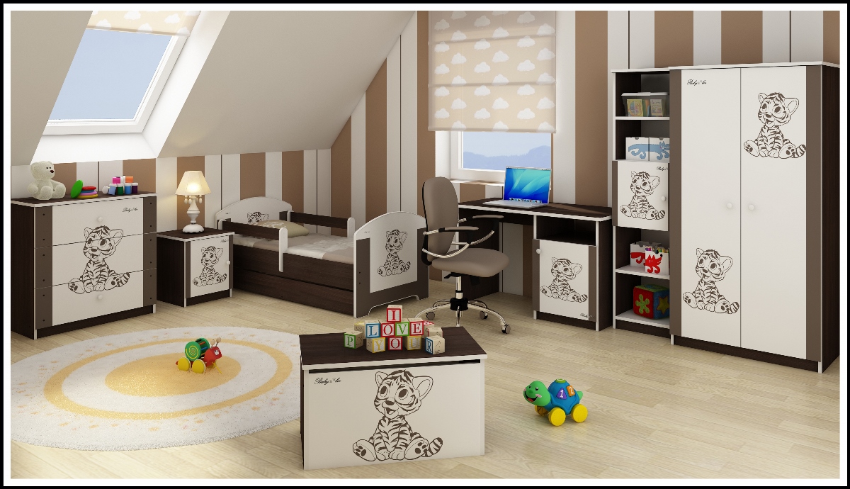 Мебель изготовлена из ДСП толщиной 16 мм, отделанного мягким шпоном, что обеспечивает максимальную безопасность ребенка. Гравированные элементы изготовлены из плит МДФ цвета светлого дуба.