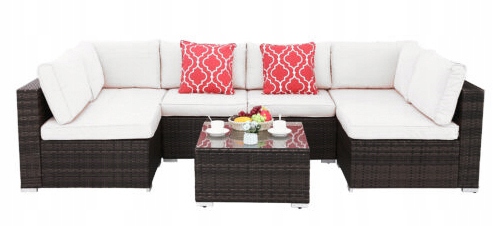 Он идеально смотрится на террасе и на лужайке. Его можно использовать как комплект или угловой диван. Стол со столешницей из закаленного стекла. Техноротанг устойчив к погодным условиям и ультрафиолету. Наволочки из пропитанного материала, съемные на молнии - можно стирать. В комплект входят 6 подушек для сиденья и 8 подушек для спинки.