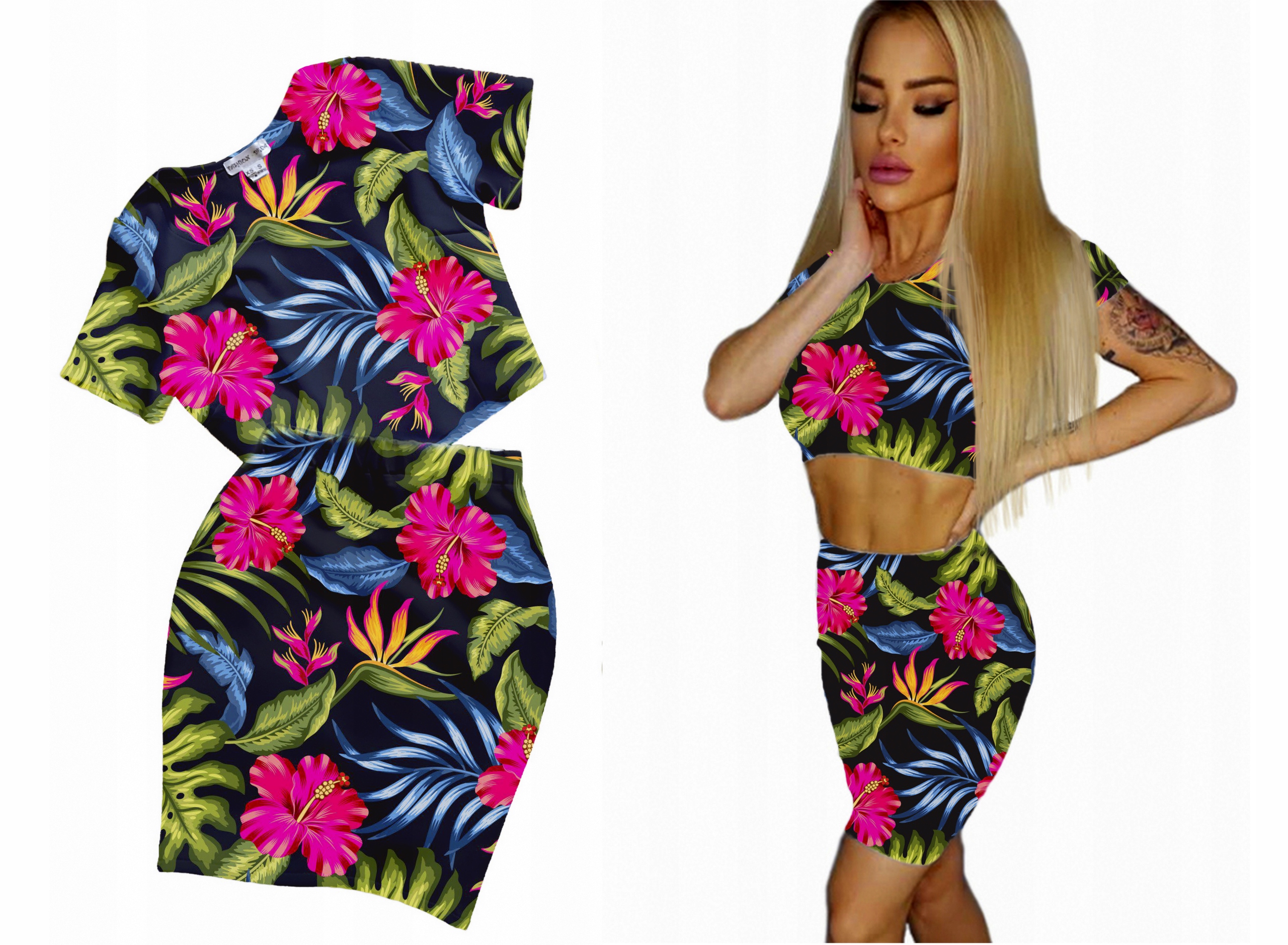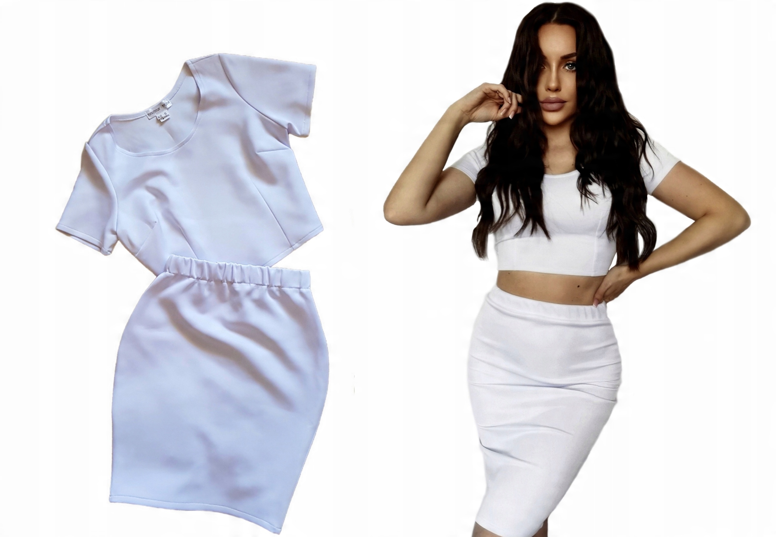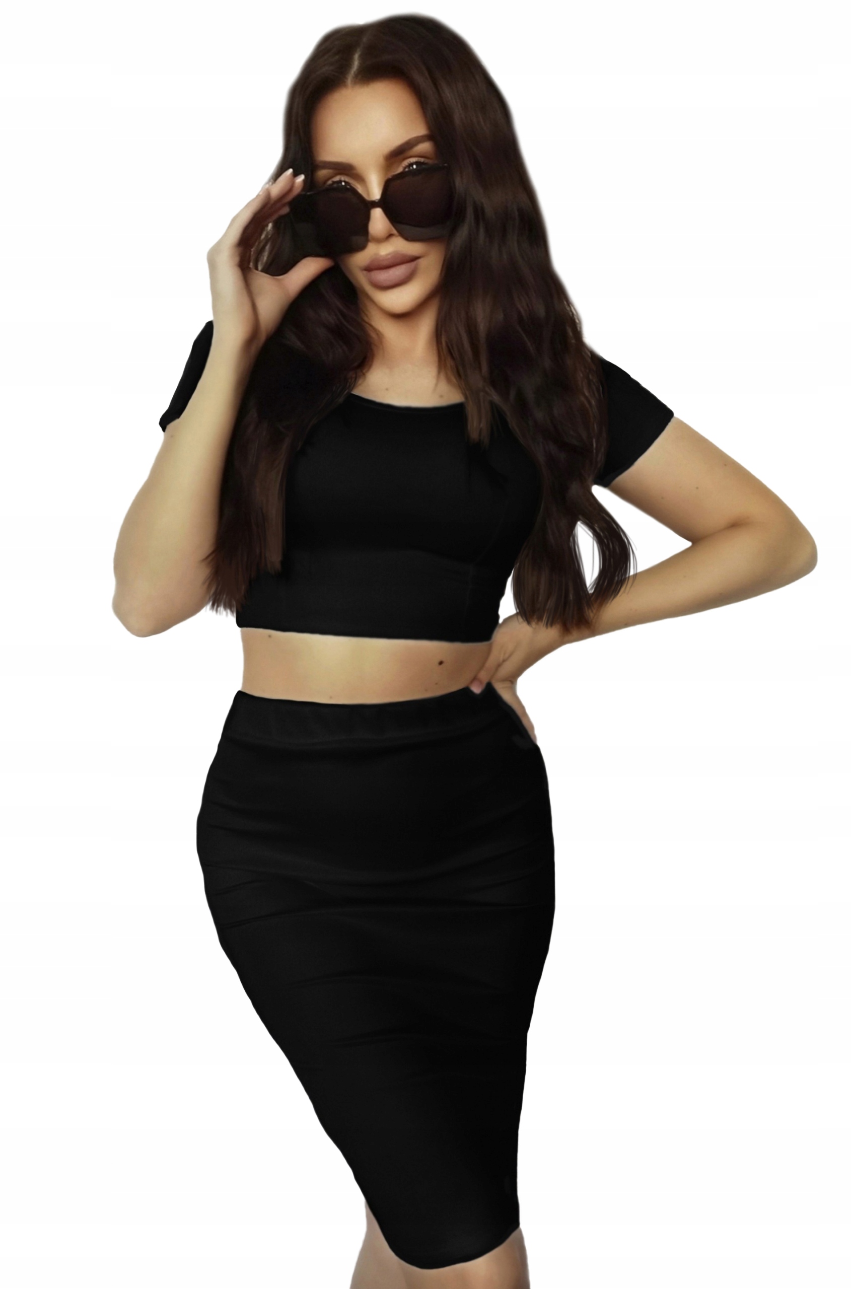 Юбка-карандаш миди выше колена + короткий топ с короткими рукавами.