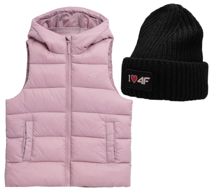При покупке комплектом вы платите меньше! Розовый стеганый пуховик и черная шапка 4Ф — идеальный комплект для переходного сезона. Безрукавка с наполнителем из синтетического пуха обеспечит оптимальное тепло, а шапка со сменными заплатами защитит голову от холода.