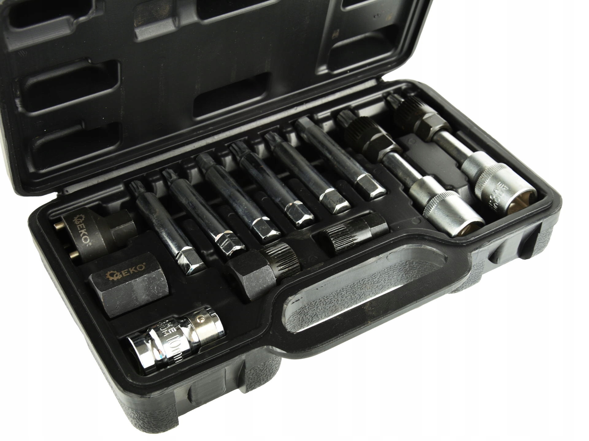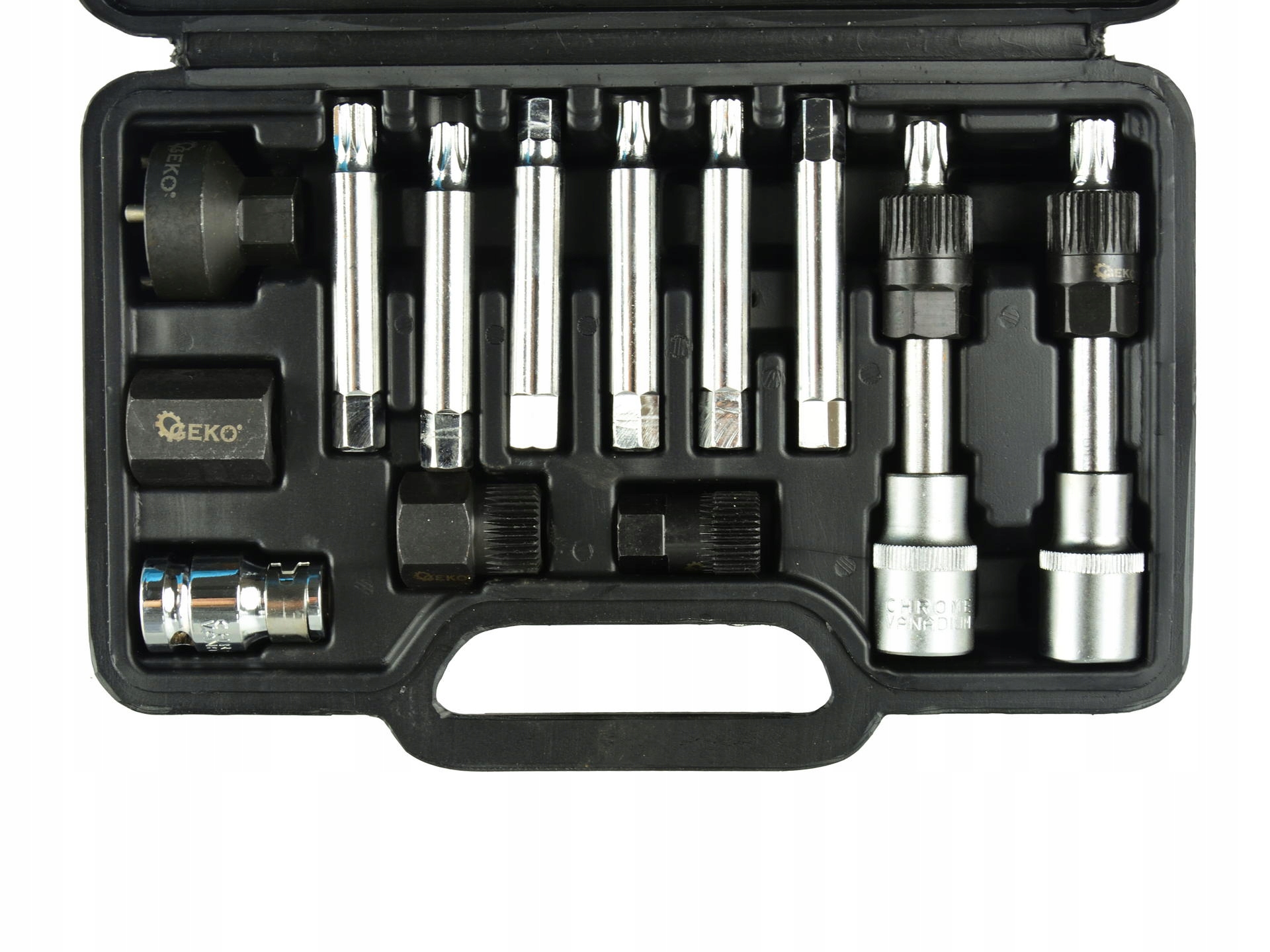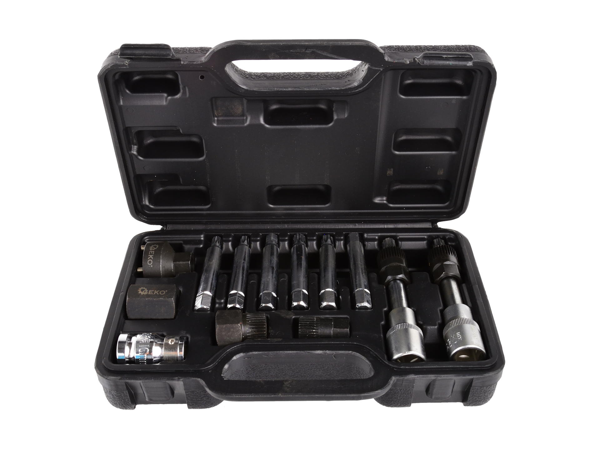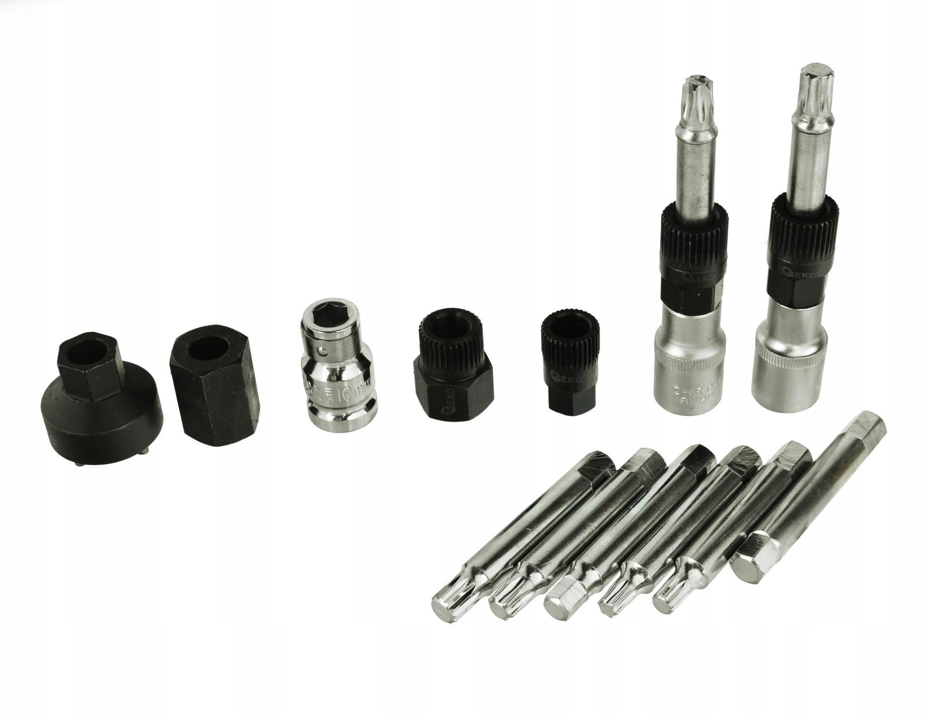 Набор ключей для монтажа и демонтажа генераторов. Ключи изготовлены из высококачественной хромованадиевой стали CrV, что делает их прочными и устойчивыми к повреждениям. Ключи позволяют одновременно открутить винт крепления шкива (с помощью соответствующей биты) и удержать шкив со сцеплением (с помощью специализированной головки).