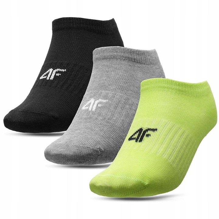 Носки для мальчиков 4F, низкие, длиной до щиколотки, комплект из трех штук, с логотипом в средней части стопы. Удобные короткие спортивные носки, обеспечивающие комфорт во время повседневной деятельности. Благодаря своей конструкции они обеспечивают высокий комфорт использования, а также обеспечивают правильную вентиляцию и дыхание стопы. Усиленные части пятки и пальцев повышают устойчивость к истиранию, а манжеты без давления удерживают носок в правильном положении.