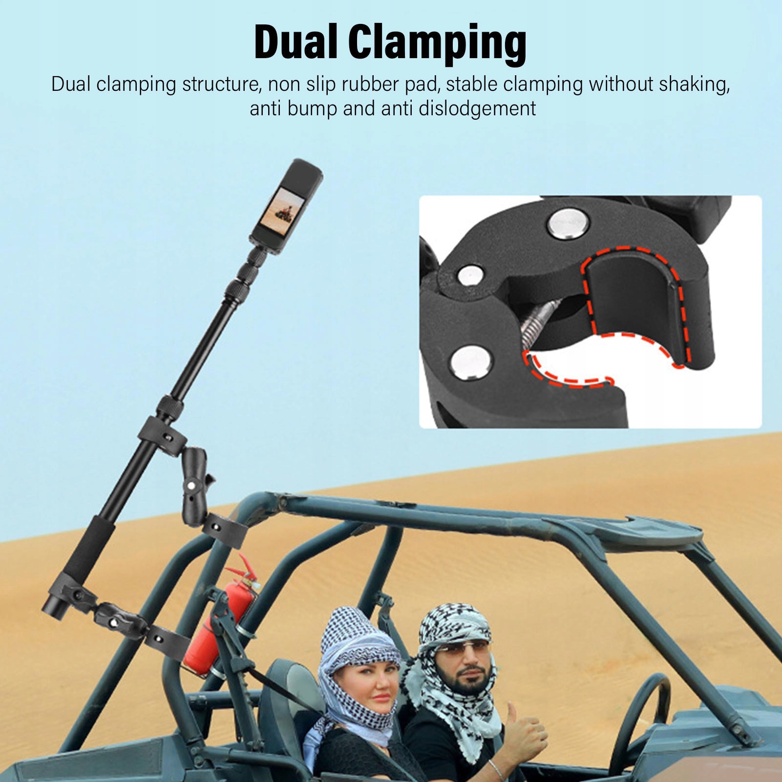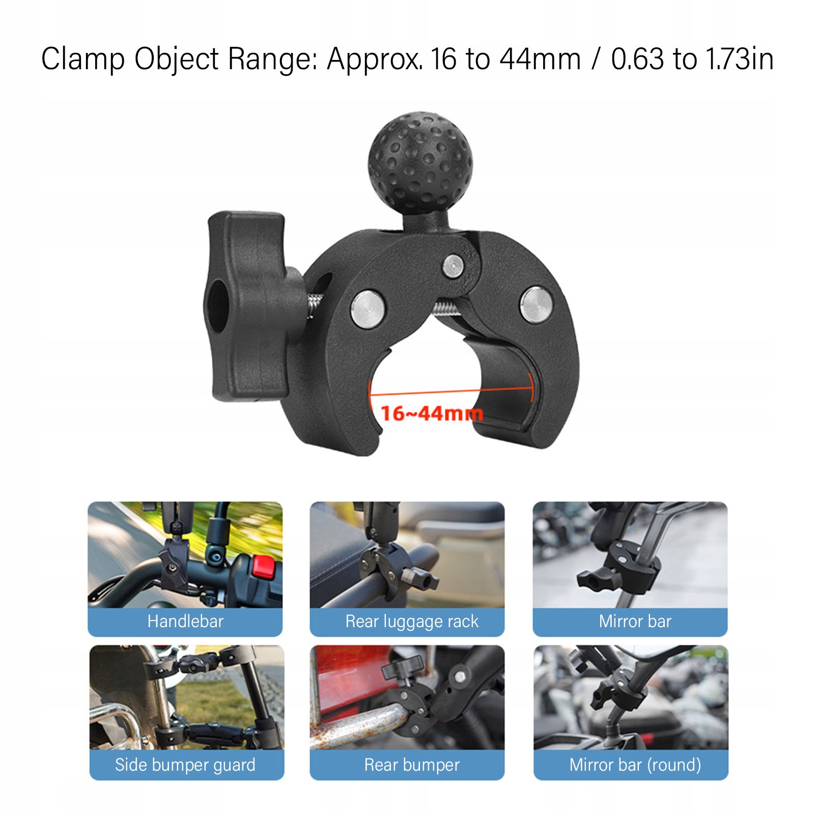 2. Стабильный и надежный зажим. Благодаря конструкции с двойным зажимом и противоскользящей накладке крепление для камеры мотоцикла обеспечивает стабильные зажимы в диапазоне от 16 до 44 мм, предотвращая движение даже на ухабистых дорогах.
