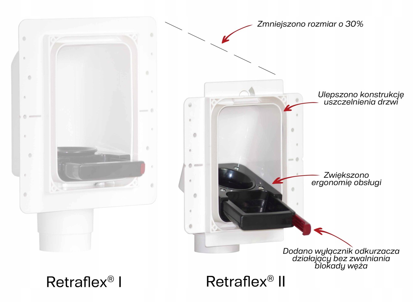 Кассета сиденья системы Retraflex® в новой версии. В измененной конструкции уменьшены габариты на 30 %, добавлен переключатель пылесоса, работающий без отпускания фиксатора шланга, улучшена эргономика управления и улучшена конструкция уплотнителя дверцы.