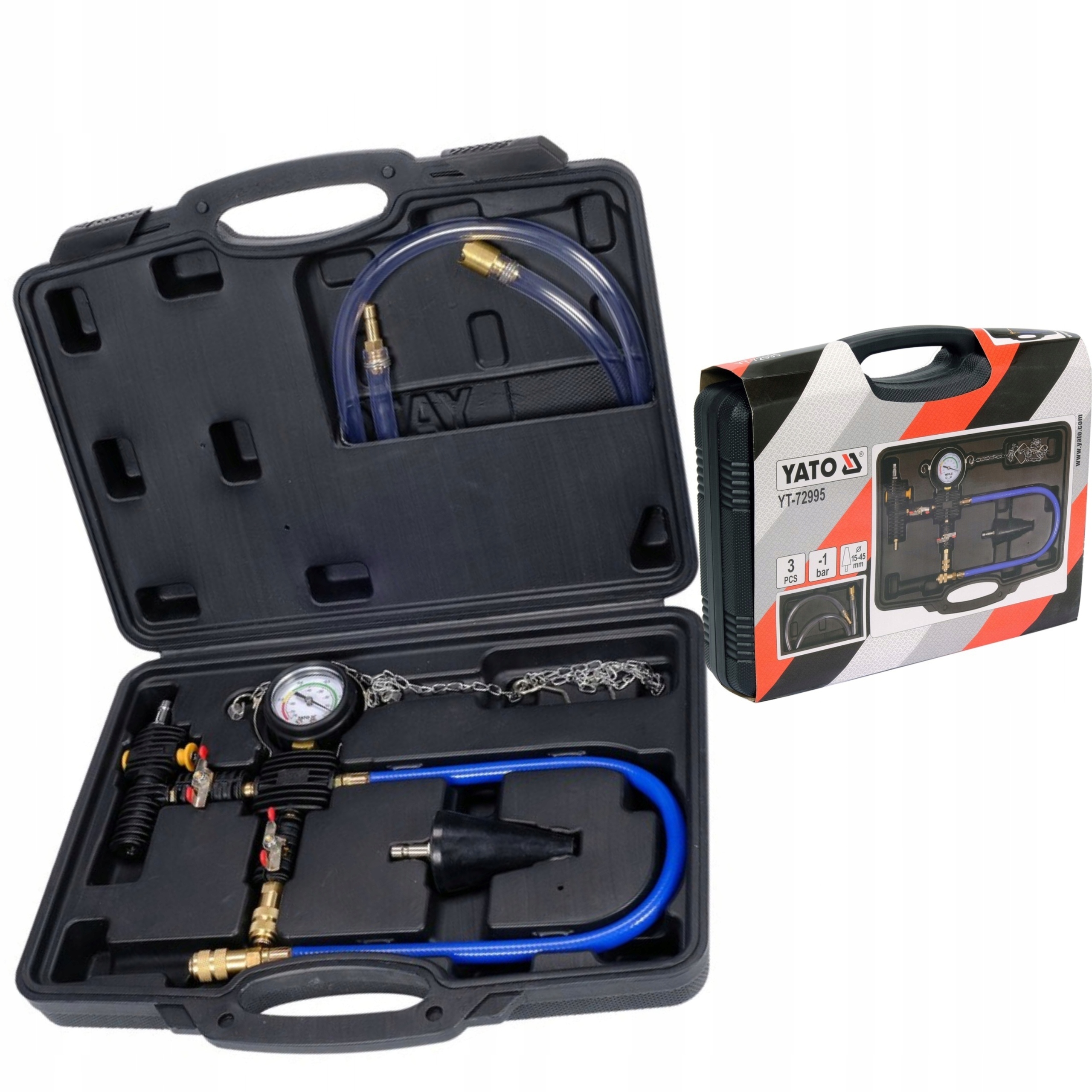 Комплект YT-72995 предназначен для быстрого вакуумного заполнения системы охлаждающей жидкостью без образования пузырьков воздуха. Это исключает необходимость прокачки системы охлаждения, сокращая время обслуживания автомобиля. В комплект входит манометр с резиновой крышкой, патрубок подвода охлаждающей жидкости и конус/переходник с диапазоном поддерживаемых диаметров от 15 до 45 мм. Все упаковано в прочный чемодан.