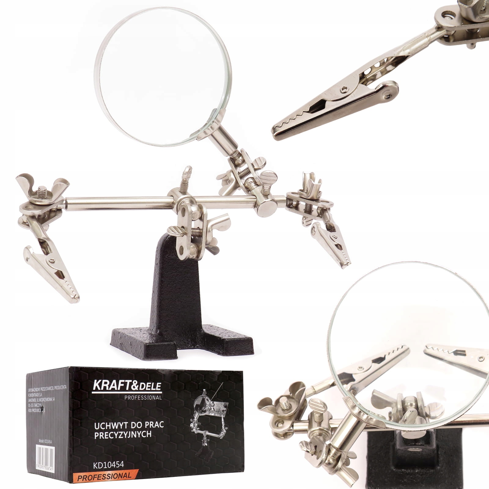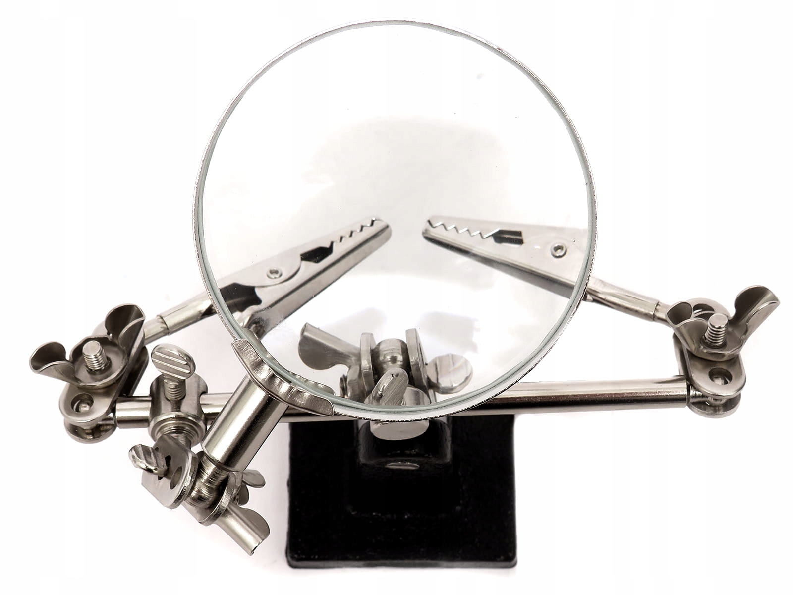 ✅ Прочное чугунное основание обеспечивает стабильную работу. Дужки устройства дополнены «зажимами-крокодилами», которые можно регулировать под любым углом.