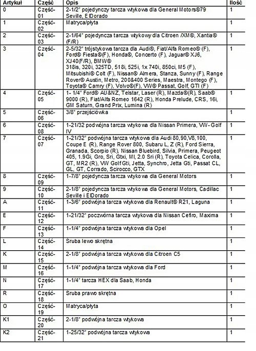 В комплект входят 17 адаптеров, адаптированных к размеру тормозных поршней для использования в таких марках автомобилей, как:
