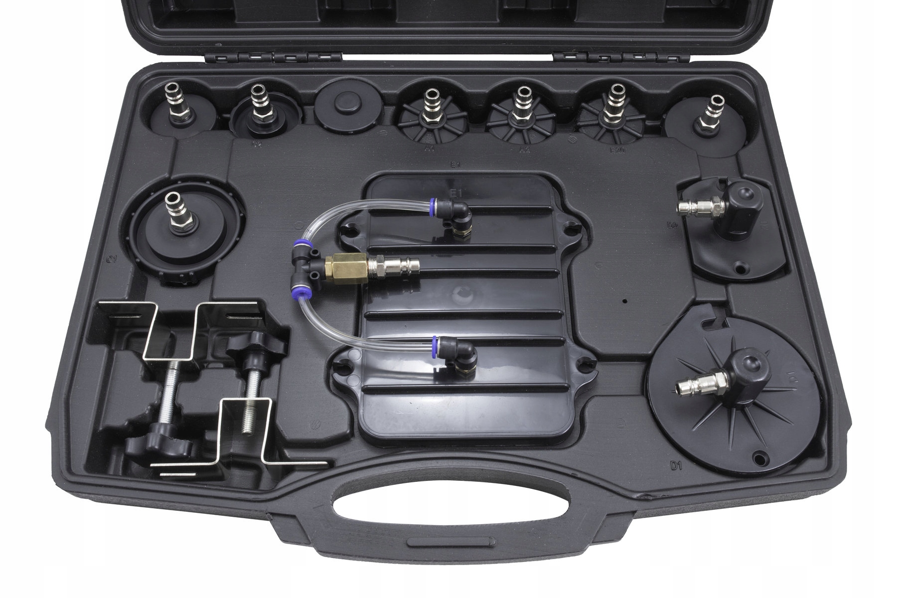 В комплекте 8 шт. переходники бачка тормозной жидкости, 3 универсальных переходника, бачок отработанной тормозной жидкости со шлангом и резиновым переходником.