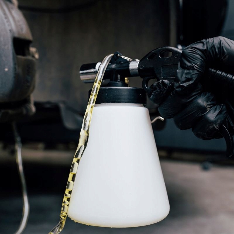 Подключается устройство замены тормозной жидкости. с одной стороны к пневмосистеме через штуцер ¼', а с другой стороны к устройству для прокачки тормозов. Благодаря созданному в бачке вакууму можно откачать тормозную жидкость из системы. Этот метод не требует традиционной «прокачки» с помощью педали тормоза, для чего обычно требуется участие второго человека.