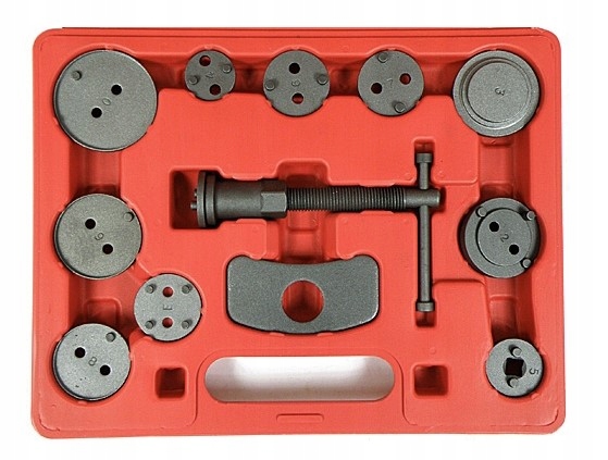 Полный набор из 12 предметов для реверса и выпрессовки тормозных поршней — незаменимый инструмент для каждой автомастерской и любителей DIY. Набор предназначен для безопасного и эффективного обслуживания дисковых тормозов, как передних, так и задних суппортов – позволяет заменить колодки без риска повредить сальники или поршни.
