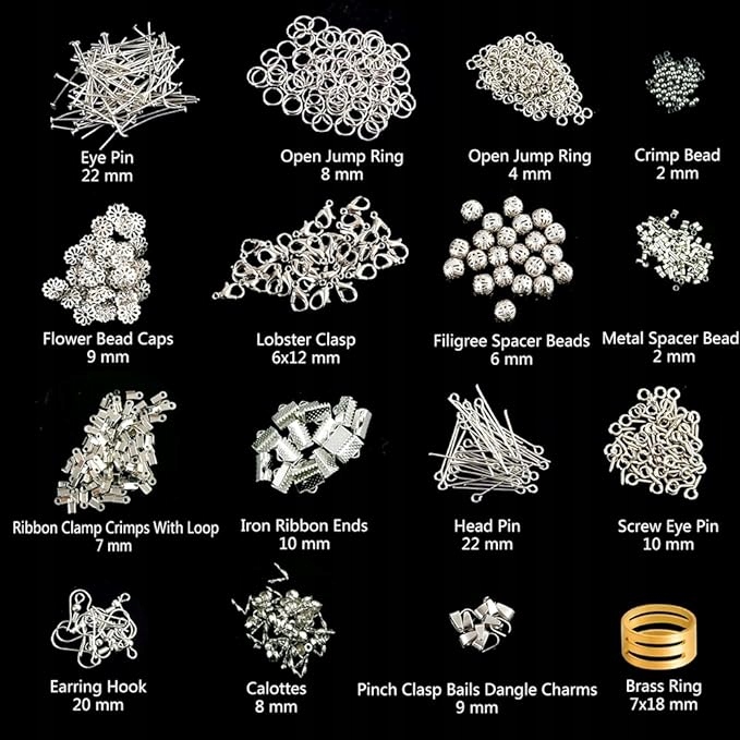 15 типов элементов, включая крепление Карабиновые, зажимные кольца, ленточные кончики, расстояние, цветочные насадки. B> Гибкий, нейлон, прозрачный, серебряный тигр хвост. Коробка: Пластик, легко транспортировать. Может иметь следы хранения или транспорта