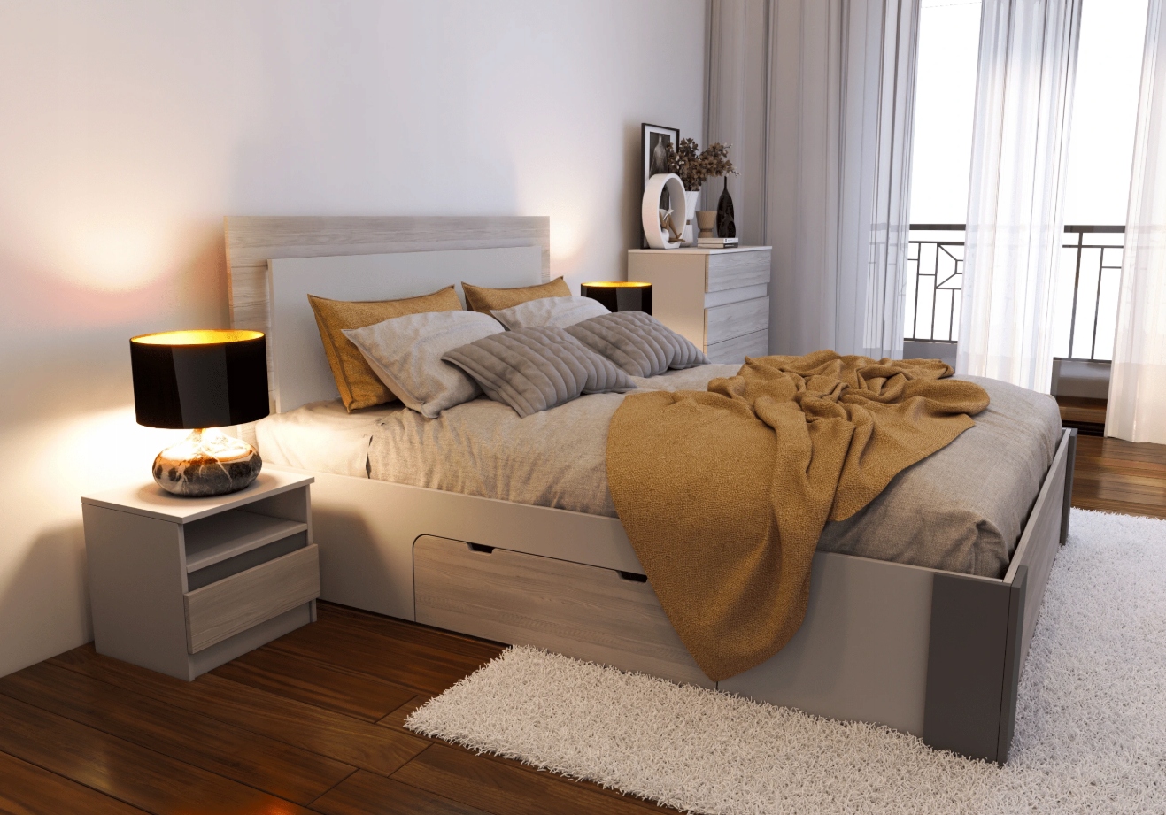 - Кровать в этом комплекте с двумя ящиками и спальной поверхностью размером 160х200 см – гарантия отдыха и хорошего самочувствия.