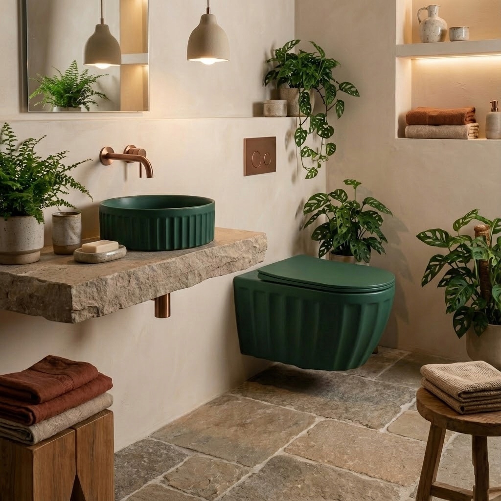 Интенсивный оттенок матча прекрасно сочетается как с минималистичным, так и с более выразительным оформлением ванной комнаты.