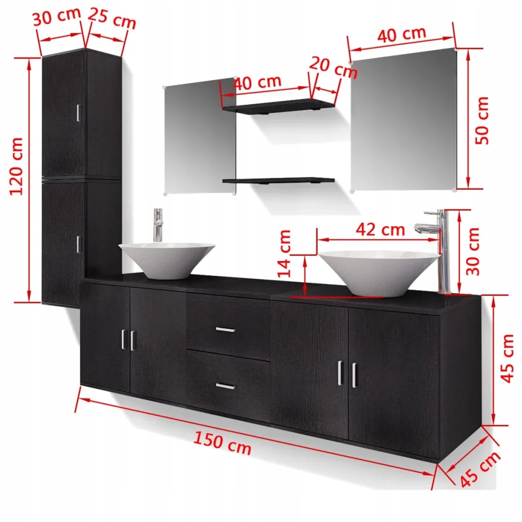 Этот комплект, состоящий из 1 настенного шкафа под умывальник, 2 настенных шкафов, 2 зеркал, 2 полок, 2 умывальников и 2 смесителей, станет отличным дополнением вашей ванной комнаты, максимально эффективно используя пространство, не жертвуя при этом стилем.