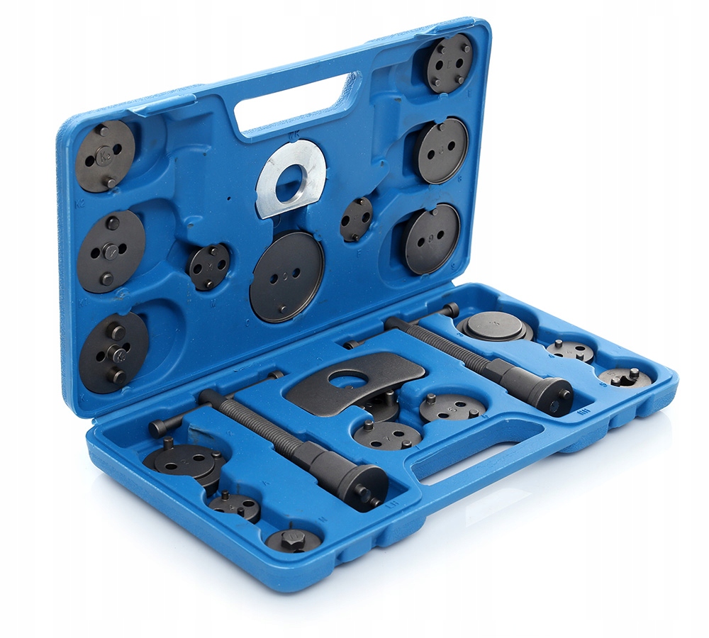 В комплект входят два пресса (правый и левый поворотный), две балки разной формы для крепления пресса к седлу зажима и широкий набор переходников. Точная посадка переходника и поршня гарантирует правильную установку поршня в цилиндр тормозного суппорта. Это, в свою очередь, защищает механику от заклинивания и заклинивания поршня в цилиндре.Рукоятка оснащена магнитным наконечником, благодаря чему удерживает пластину, соответствующую данному поршню, на оси. Набор рекомендован для общего механического обслуживания автомобилей.Идеален для работы с керамическими поршнями.