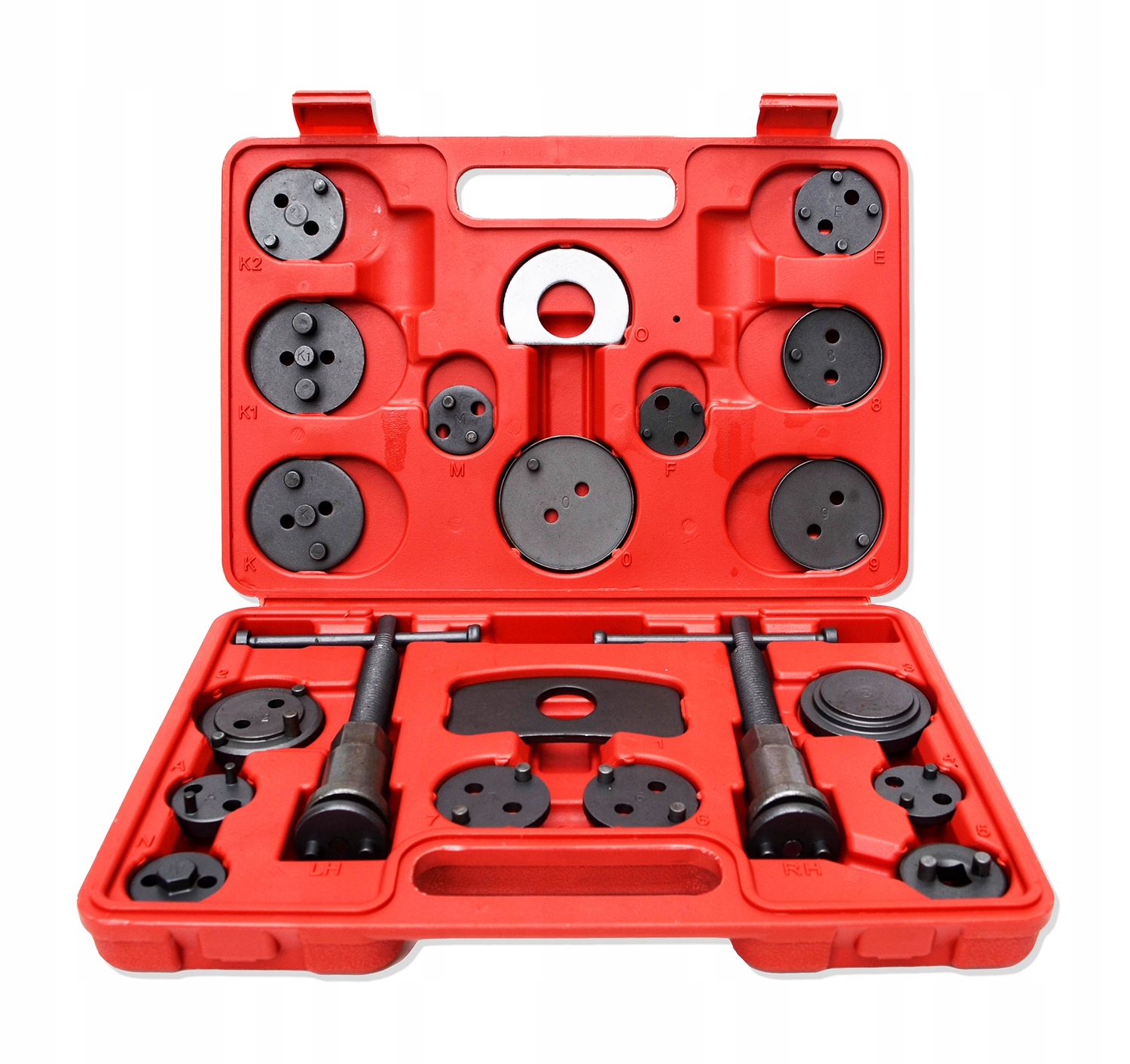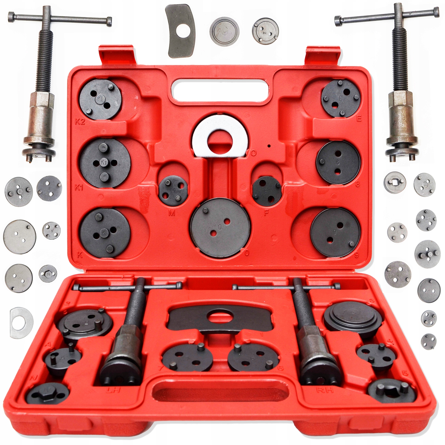 В комплект входят два пресса (правый и левый поворотный), две балки разной формы для прижима пресса к седлу суппорта и 17 адаптеров, адаптированных под размер тормозных поршней, используемых в Большинство легковых автомобилей производится на европейском и азиатском рынках. Набор изготовлен из стали высочайшего качества, упакован в прочный пластиковый кейс, ударопрочный и очень удобный для ношения. Ручка оснащена магнитным наконечником, удерживающим каждый адаптер. Идеально подходит для работы с керамическими поршнями.