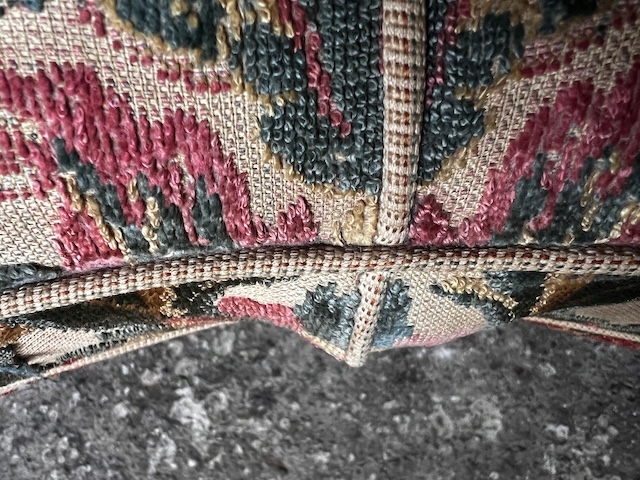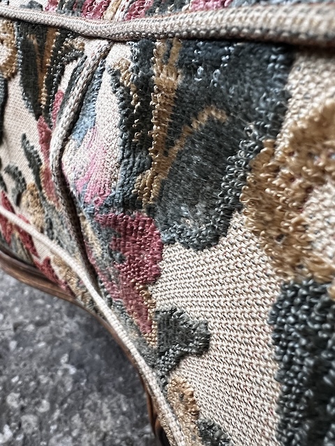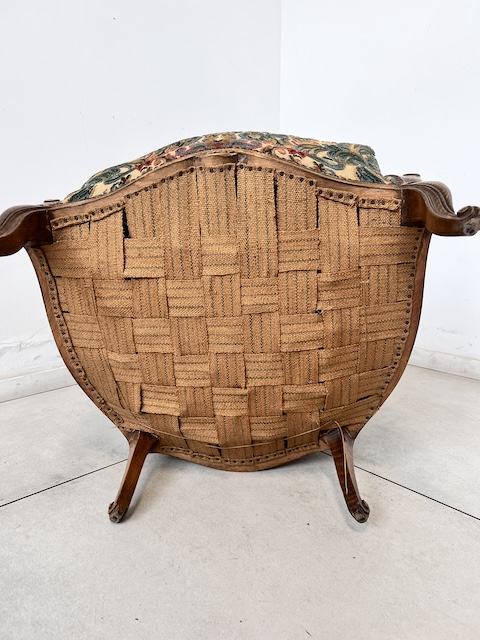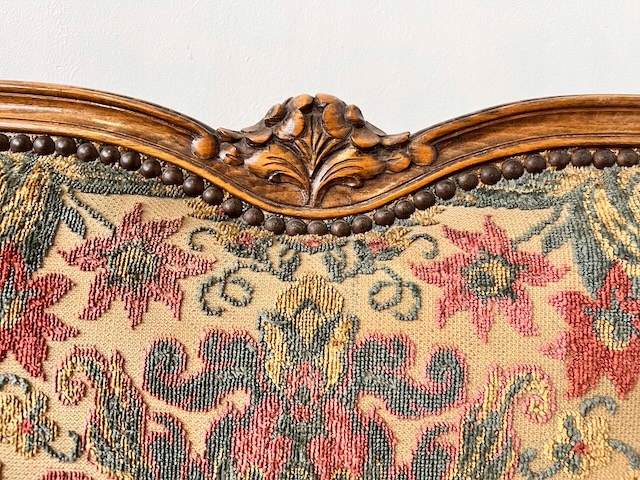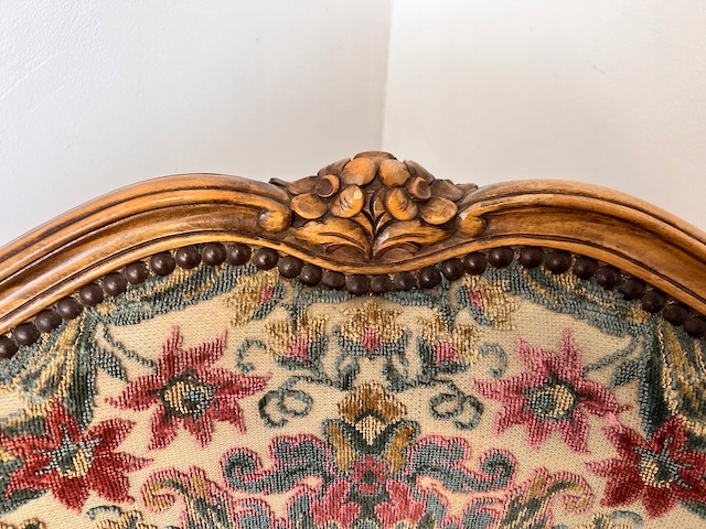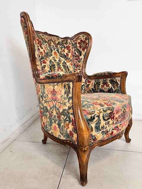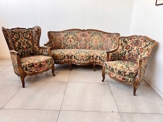 Диванный комплект: трехместный диван и два кресла в стиле Бержер. Эффективно. Выполнено в стиле Людвика. Он имеет гнутый резной деревянный каркас, ножки-кабриоль и оригинальную обивку с богатым цветочным узором. Жаккардовая ткань представлена в редких цветах. На бежевом фоне — бордовые цветы и петро-золотые листья. Подлокотники на каждом предмете мебели изношены. В остальном ткань чистая и в хорошем состоянии. Все сиденья на пружинах. Древесина дуба без повреждений и дефектов. На мебели имеются типичные следы использования. У них все стабильно. В диване наверняка торчит фрагмент ленты или опорной планки с правой стороны сиденья. Это элемент конструкции, типичный для мягкой мебели. Это не влияет на устойчивость и удобство использования сиденья. Это показано на последних двух фотографиях. Комплект идеально впишется в гостиную, офис, классический, эклектичный, французский и гламурный интерьеры. Он готов к вставке.