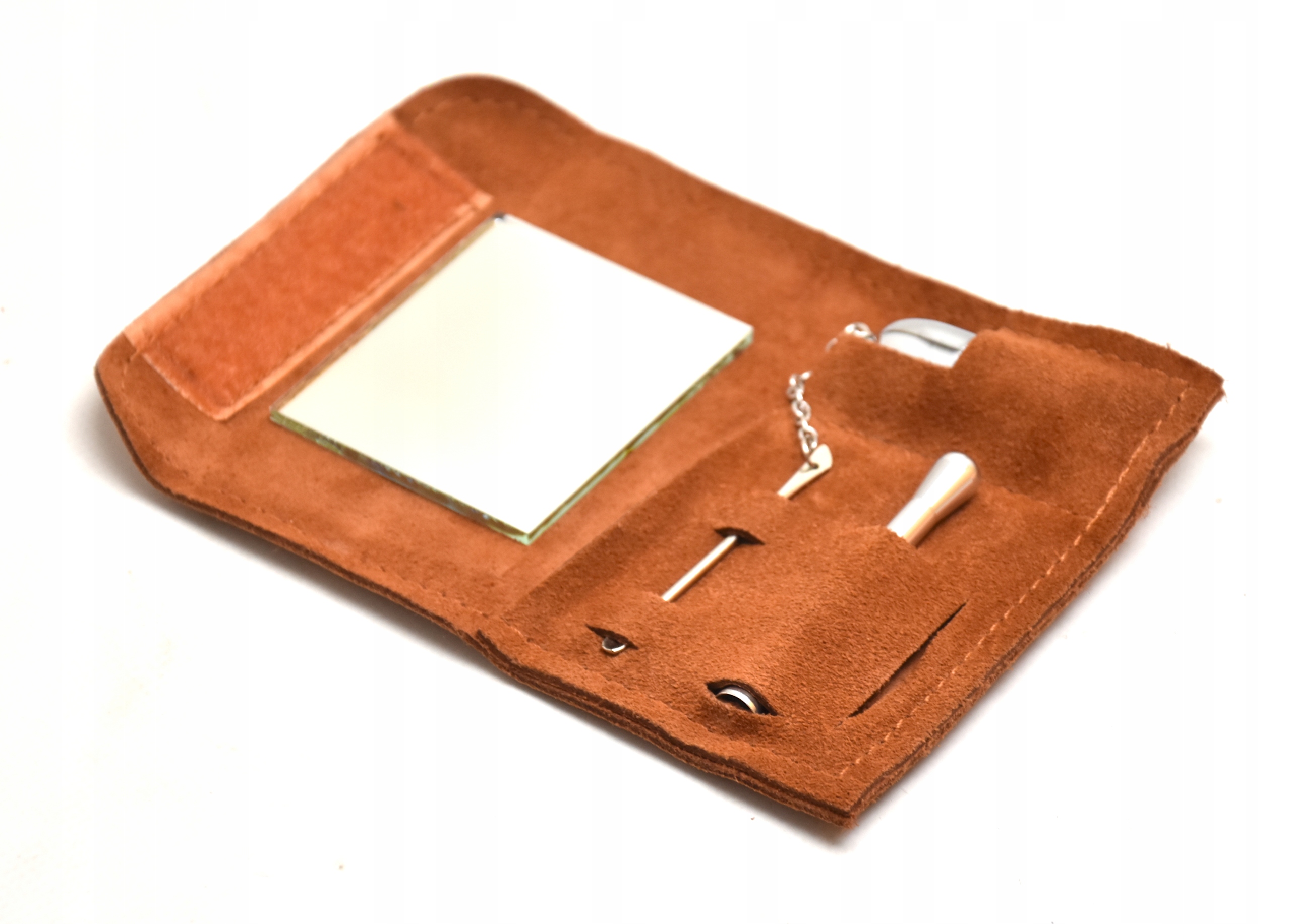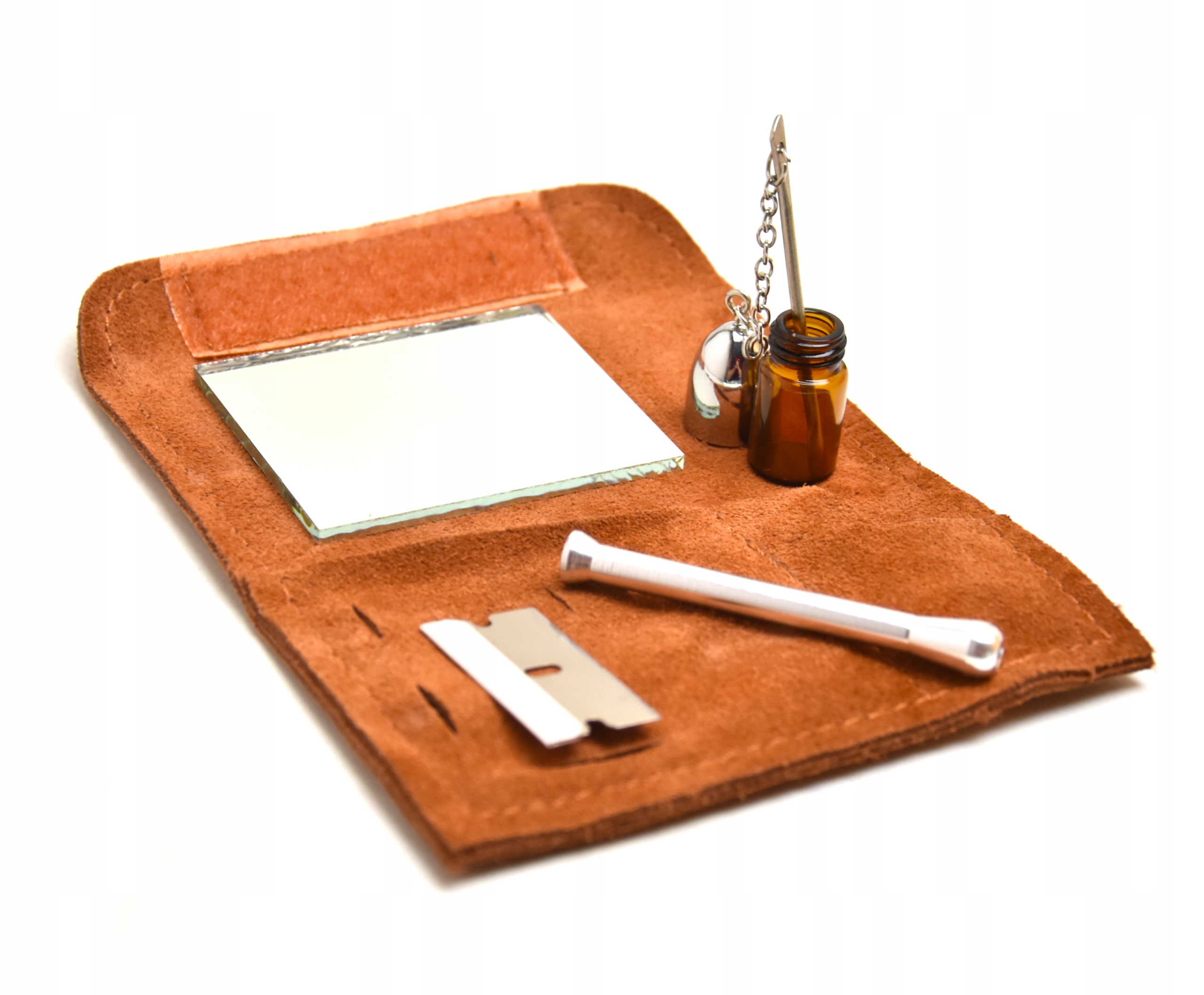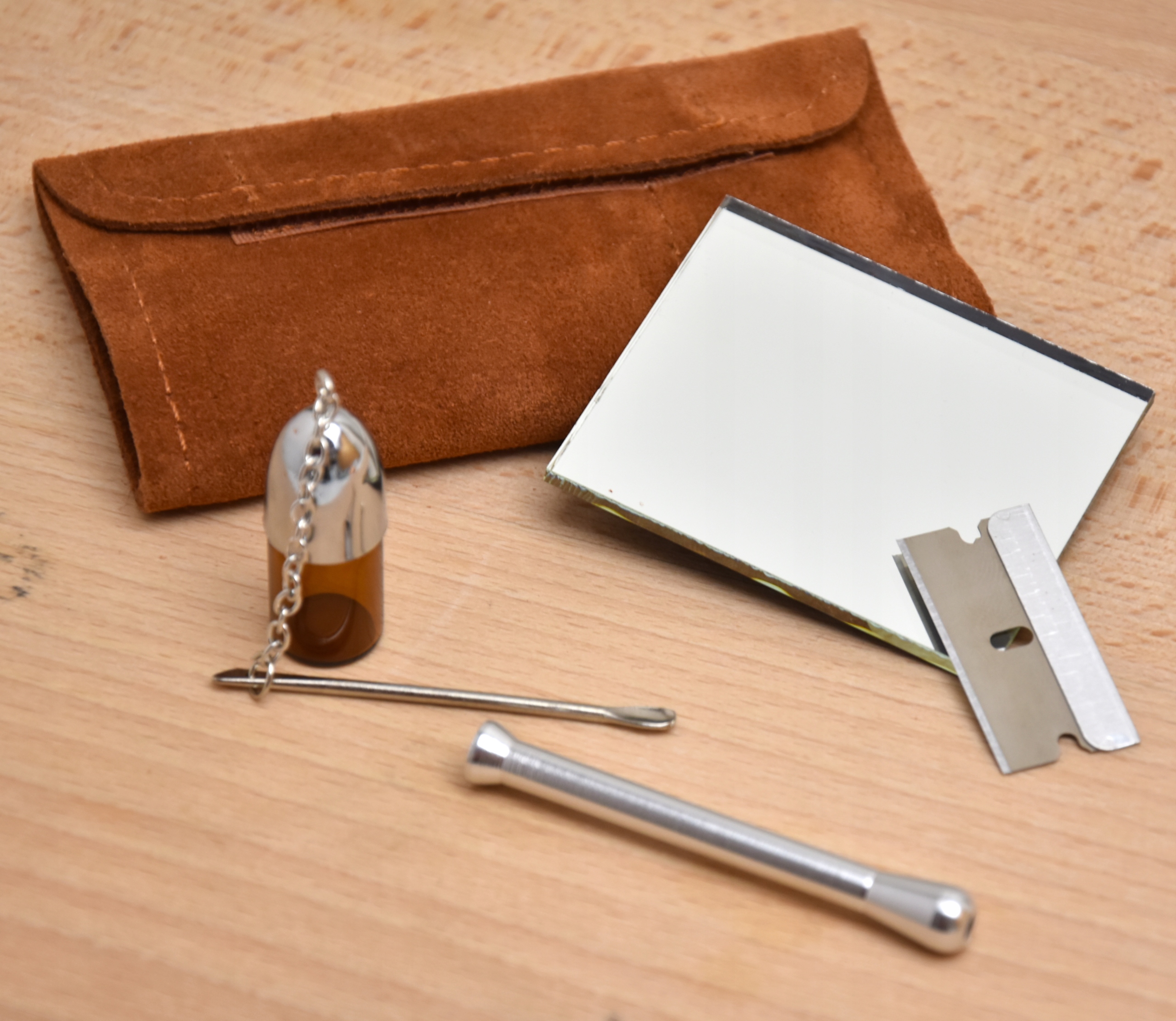 - В набор входят такие полезные инструменты, как трубка, емкость, ложка, лезвие и зеркало, и все это в чудесном замшевом футляре.