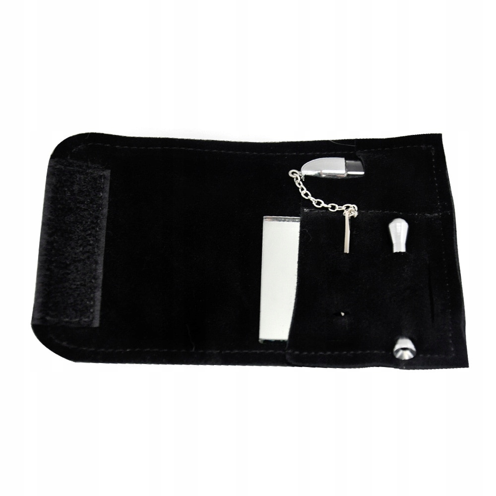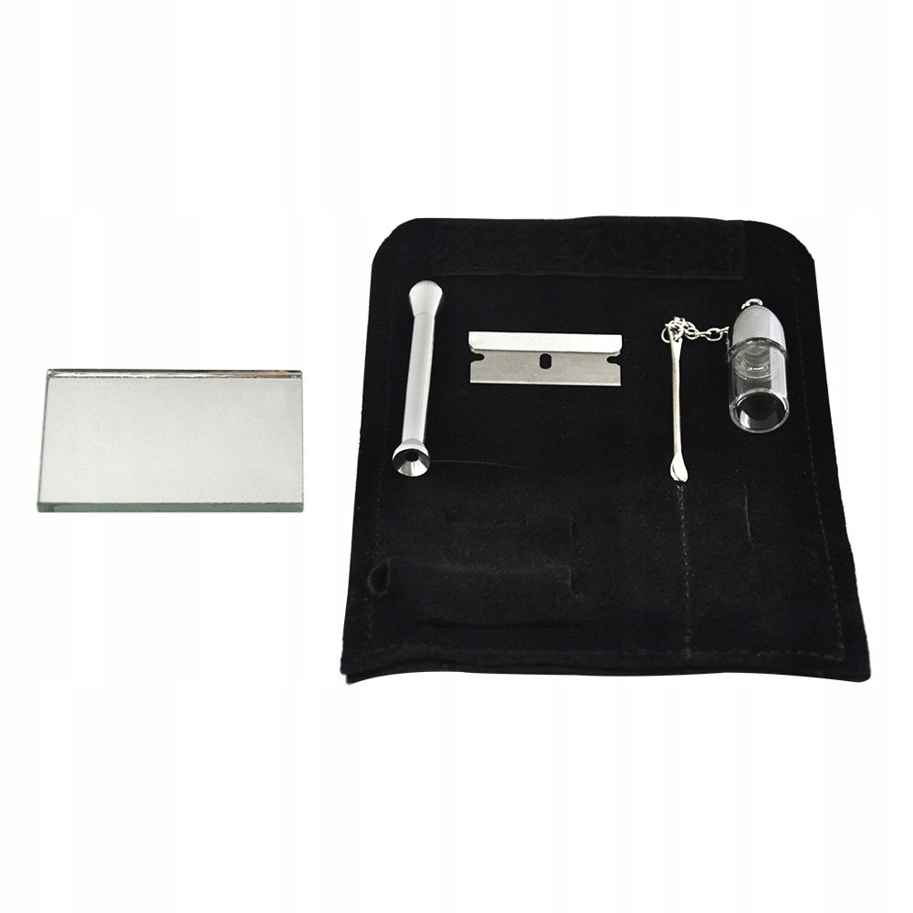 - В набор входят такие полезные инструменты, как трубка, емкость, ложка, лезвие и зеркало, и все это в чудесном замшевом футляре.