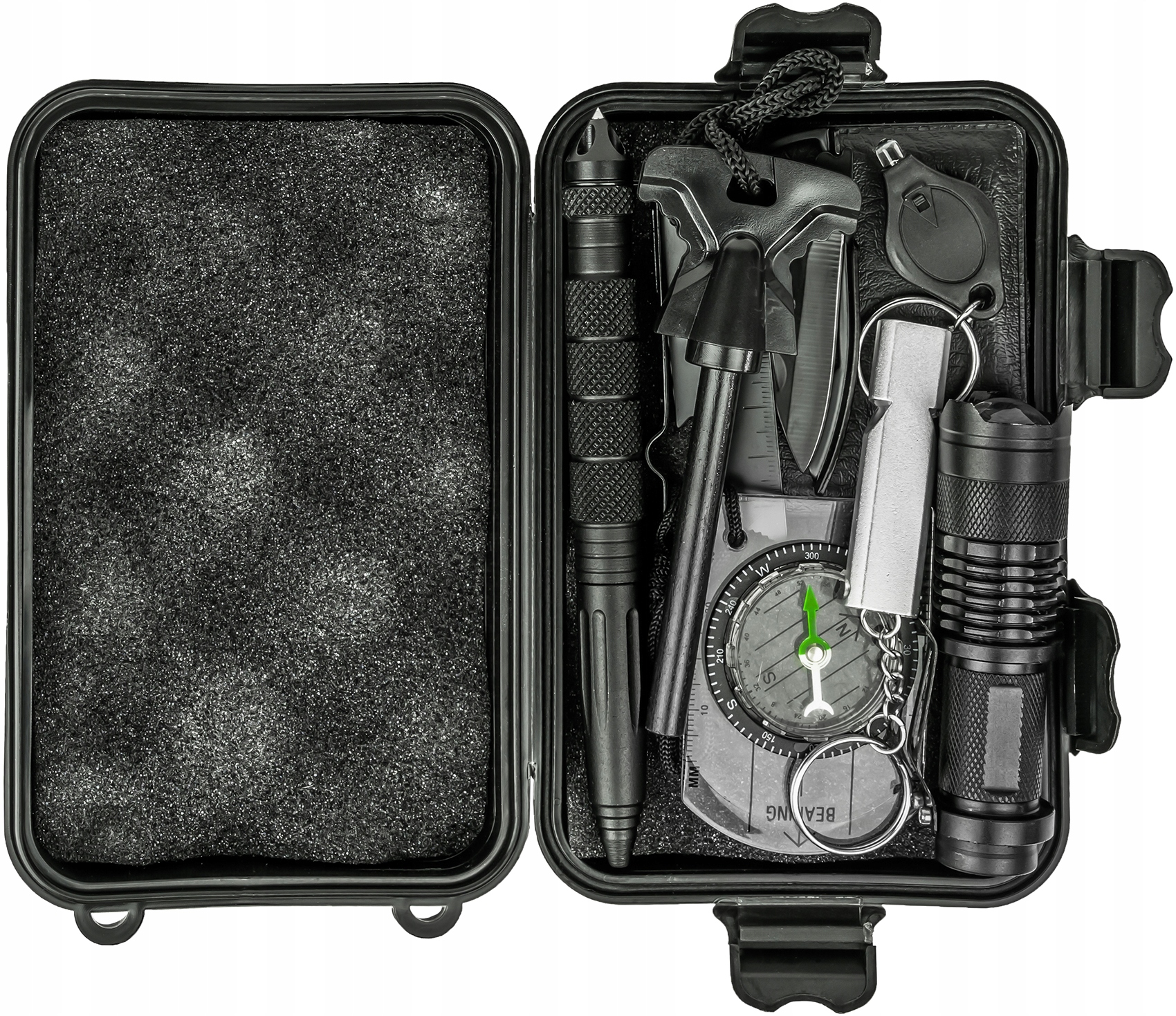 Набор пригодится в основном во время путешествий и экспедиций; незаменимая вещь для каждого любителя выживания и пешего туризма. Все дело в водонепроницаемом кейсе, закрывающемся на 4 защелки, внутри для защиты наполнено мягкой подкладкой. Кейс компактный, поэтому не займет много места в рюкзаке, а также имеет 2 отверстия сверху, за которые его можно повесить, например, за веревку на шею.