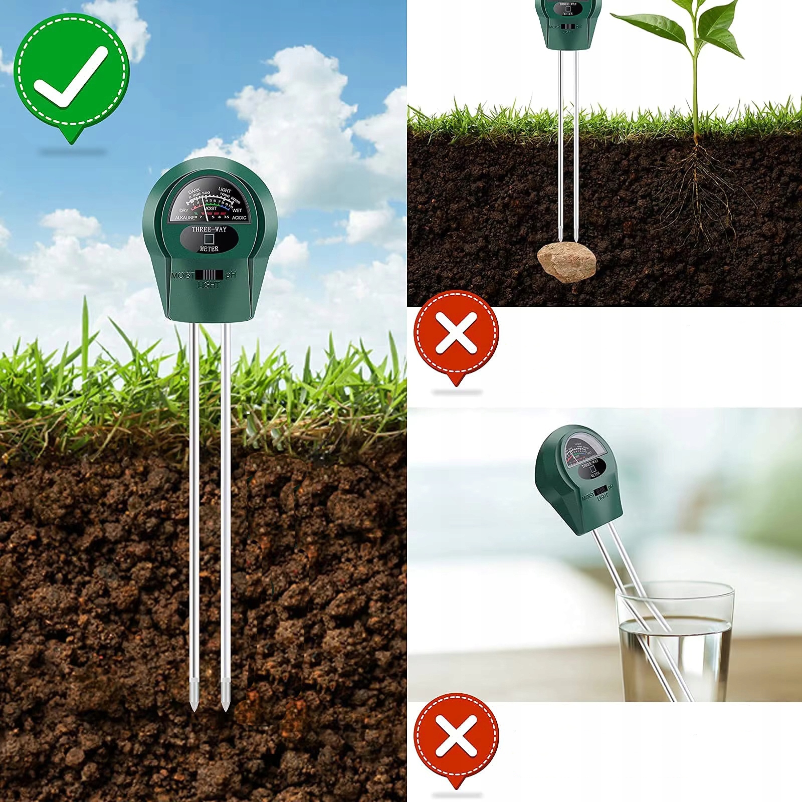 Простой в использовании: наш тестер не требует батареи или питания, поэтому вы можете использовать его в любое время внутри и снаружи. Чтобы использовать его, просто положите тестер в почву, чтобы прочитать значение. Примечание. Тестер почвы не может быть использован для проверки рН жидкостей (чистая вода и другие жидкости, такие как уксус, фруктовый сок). Если почва слишком сухая, а индикатор почвы не изменяется, ее следует поливать перед испытанием. Идеальный инструмент