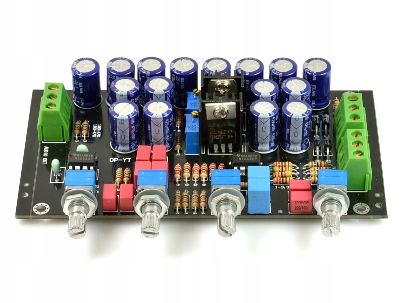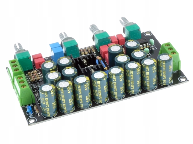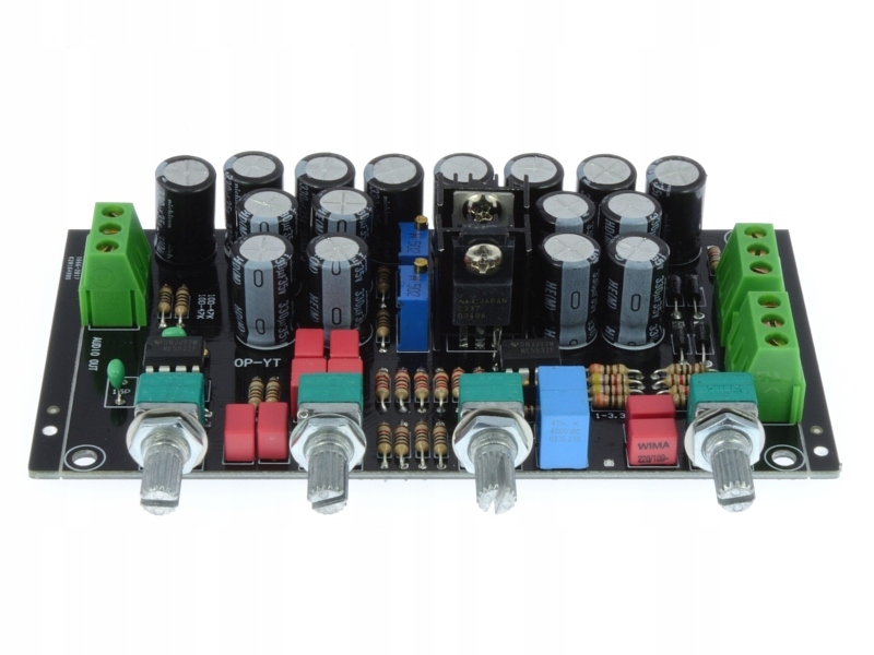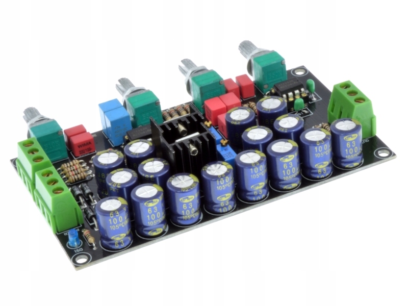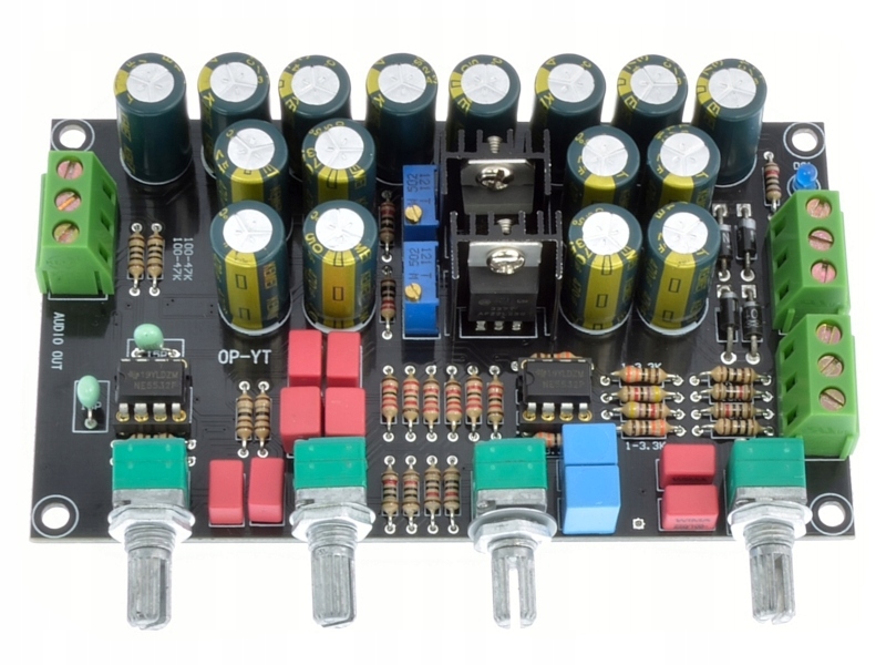 В модуле имеется 4 потенциометра – 3 шт. для регулировки тона, а четвертый — для регулировки общей громкости.