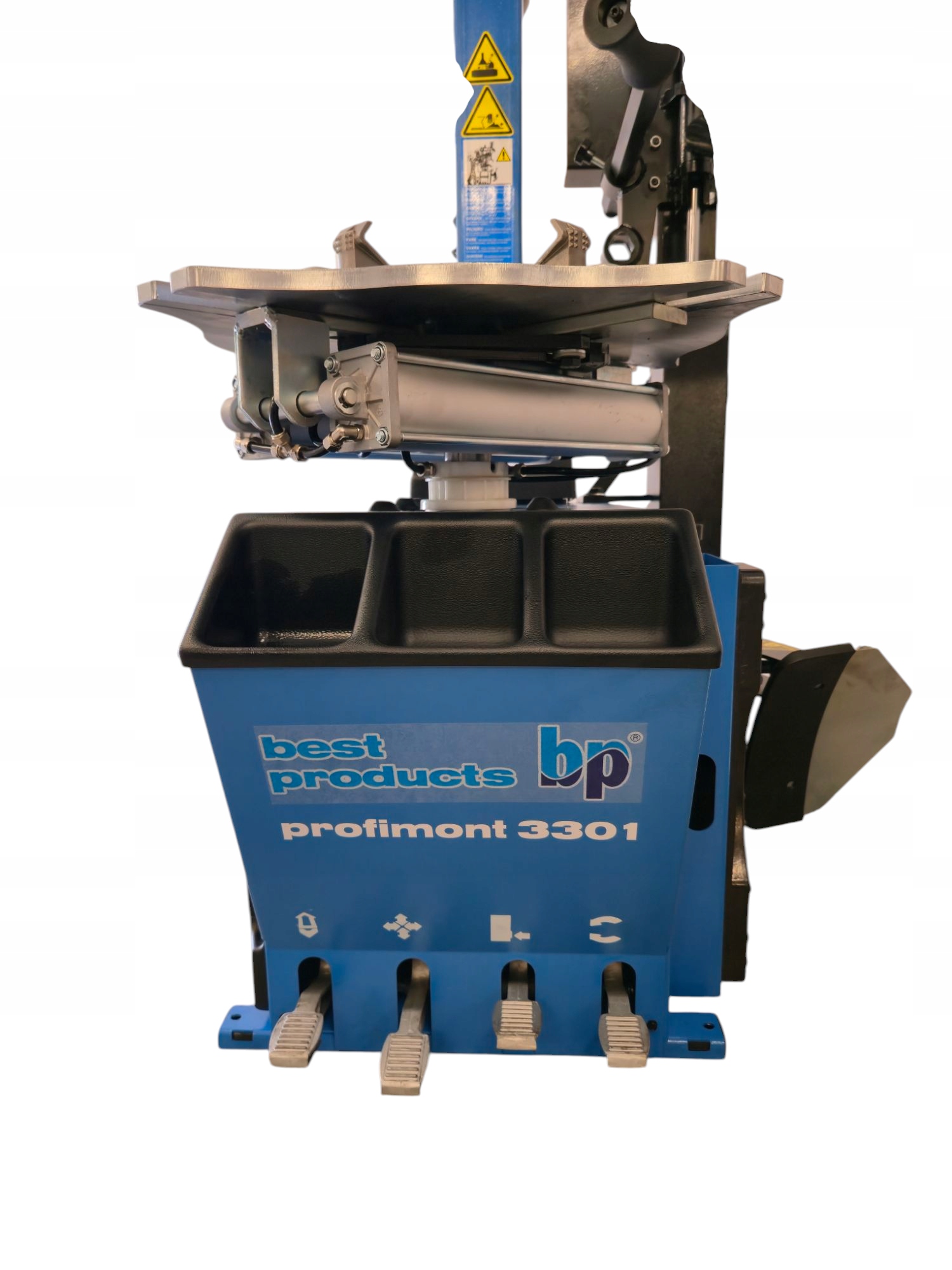 PROFIDYNA 3301 – машина-автомат с мачтой, откидываемой назад с помощью пневмопривода. Заводская комплектация — адаптер для низкопрофильных шин и RUN FLAT. Блокировка вертикального рычага также происходит автоматически и одновременно отодвигает монтажную головку от обода в радиальном и осевом направлении примерно на 20 мм. 3 мм (это значение можно регулировать). Вертикальная мачта перемещается к краю обода автоматически с помощью пневматического привода.
