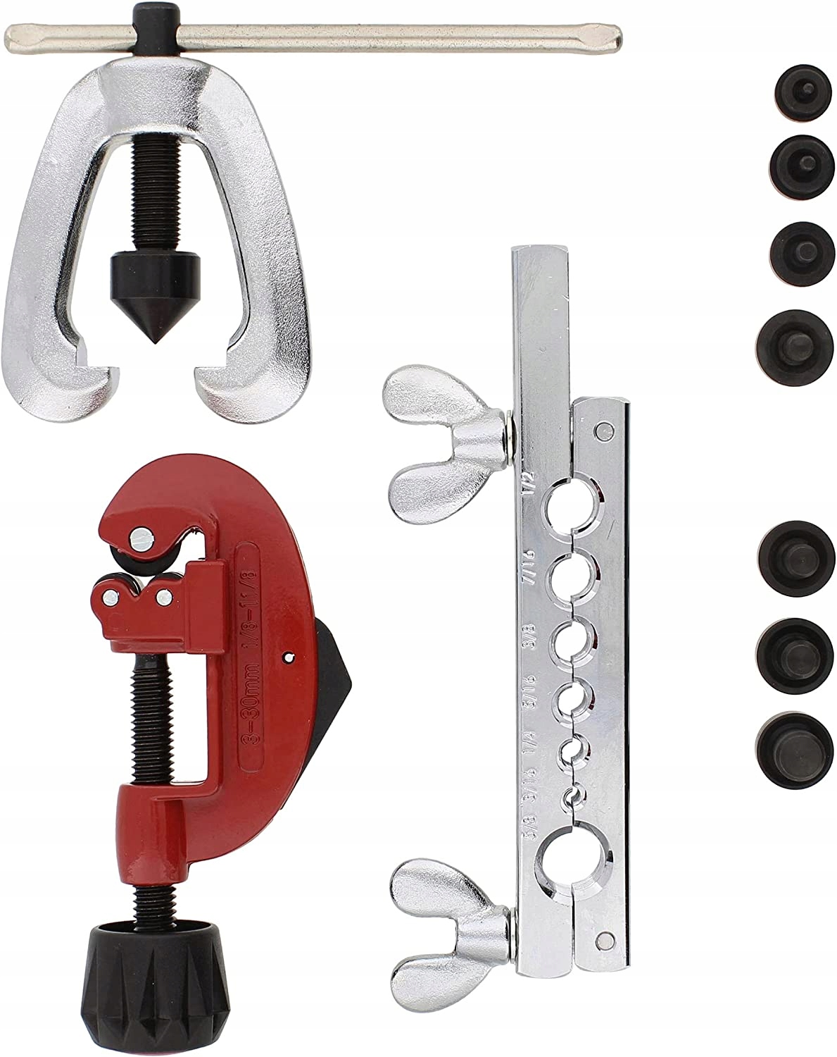 Комплект для опрессовки тормозных и топливных магистралей. Подходит для резки и расширения медных, латунных и алюминиевых труб и кабелей со стенками толщиной до 1 мм.