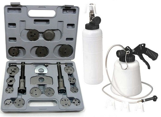 В комплект входят два пресса (правый и левый поворотный), две балки разной формы для прижима пресса к седлу суппорта и 17 адаптеров, адаптированных под размер тормозных поршней, используемых в большинстве легковых автомобилей, выпускаемых на европейском и азиатском рынках. .