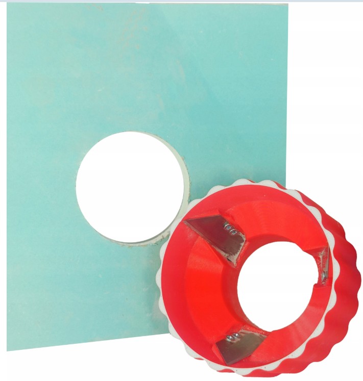 НАБОР СТАНКА ДЛЯ СДЕЛКИ ФАСКИ ДЛЯ ЭЛЕКТРИЧЕСКИХ КОРОБОК 68 ММ С 3 ЛЕЗВИЯМИ И РУГУГОМ/ 45° ПО ПОЛОТНИЮ ДЛЯ ГИПСОВЫХ ПЛИТ