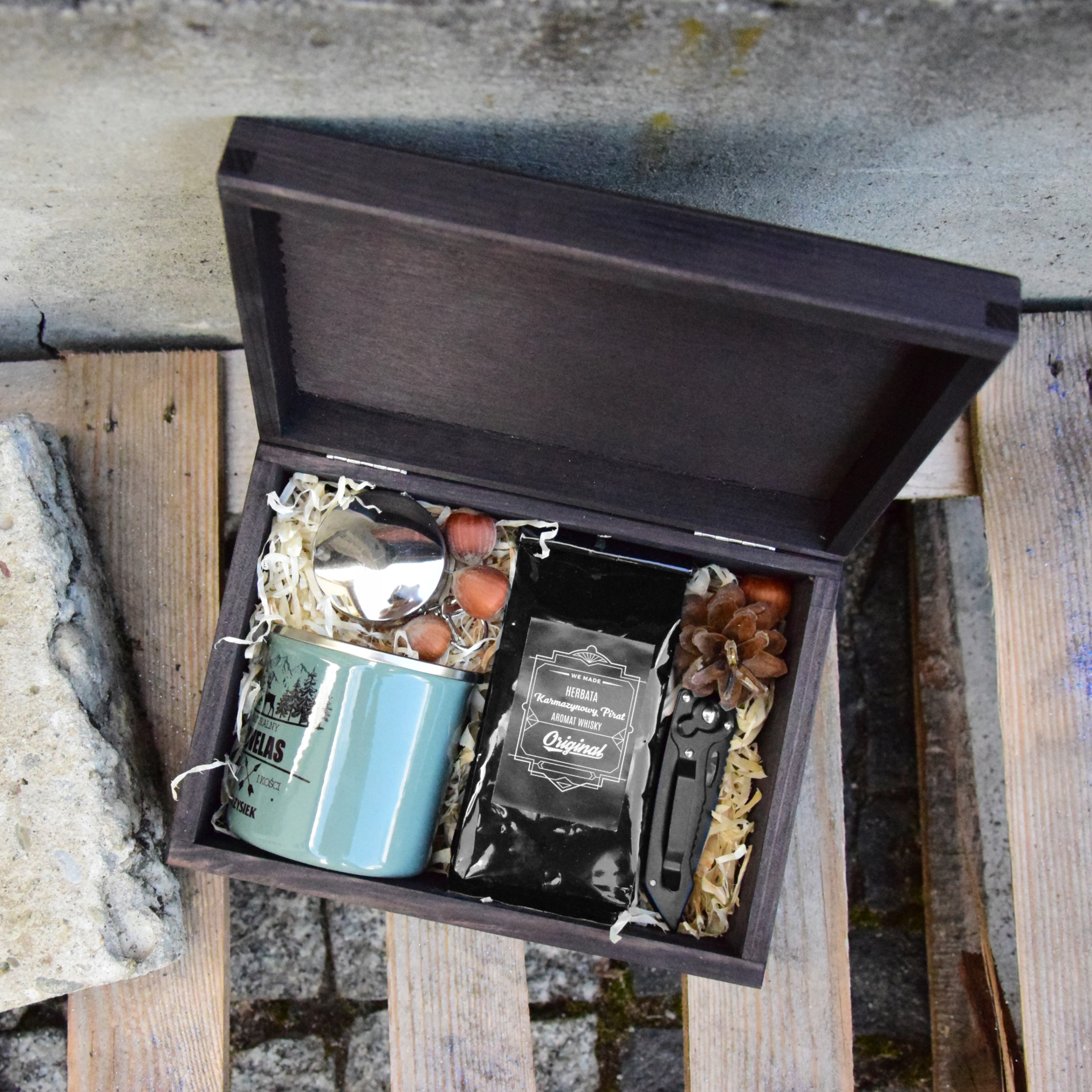 Предлагаем оригинальную коробку с мужскими гаджетами и персонализацией. Такая подарочная коробка принесет радость и станет сувениром о необыкновенном событии, а также пригодится для многих мужских встреч и поездок.