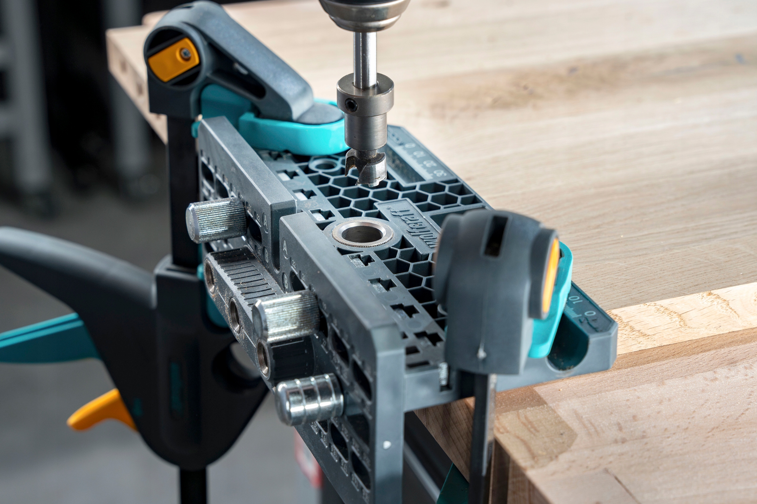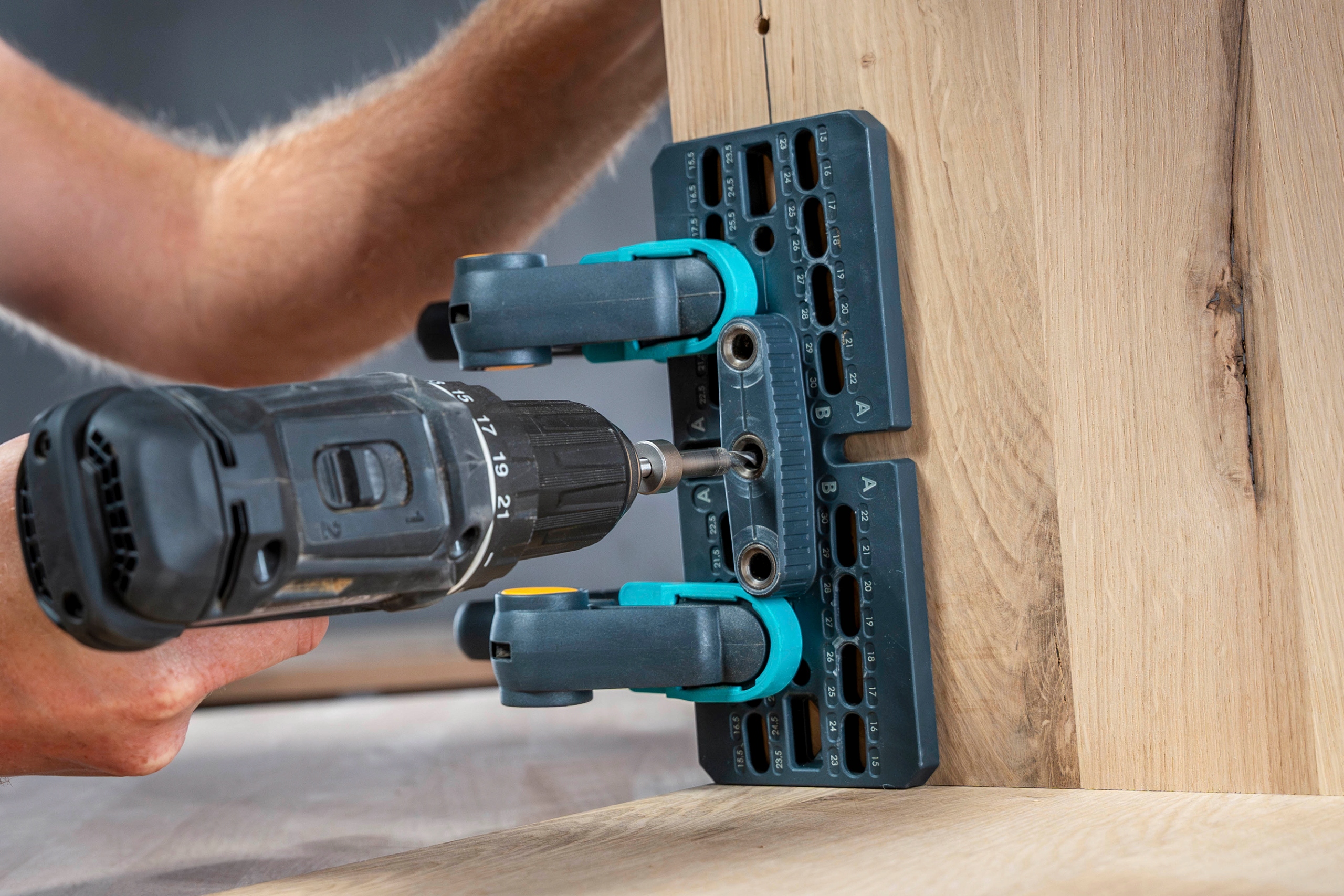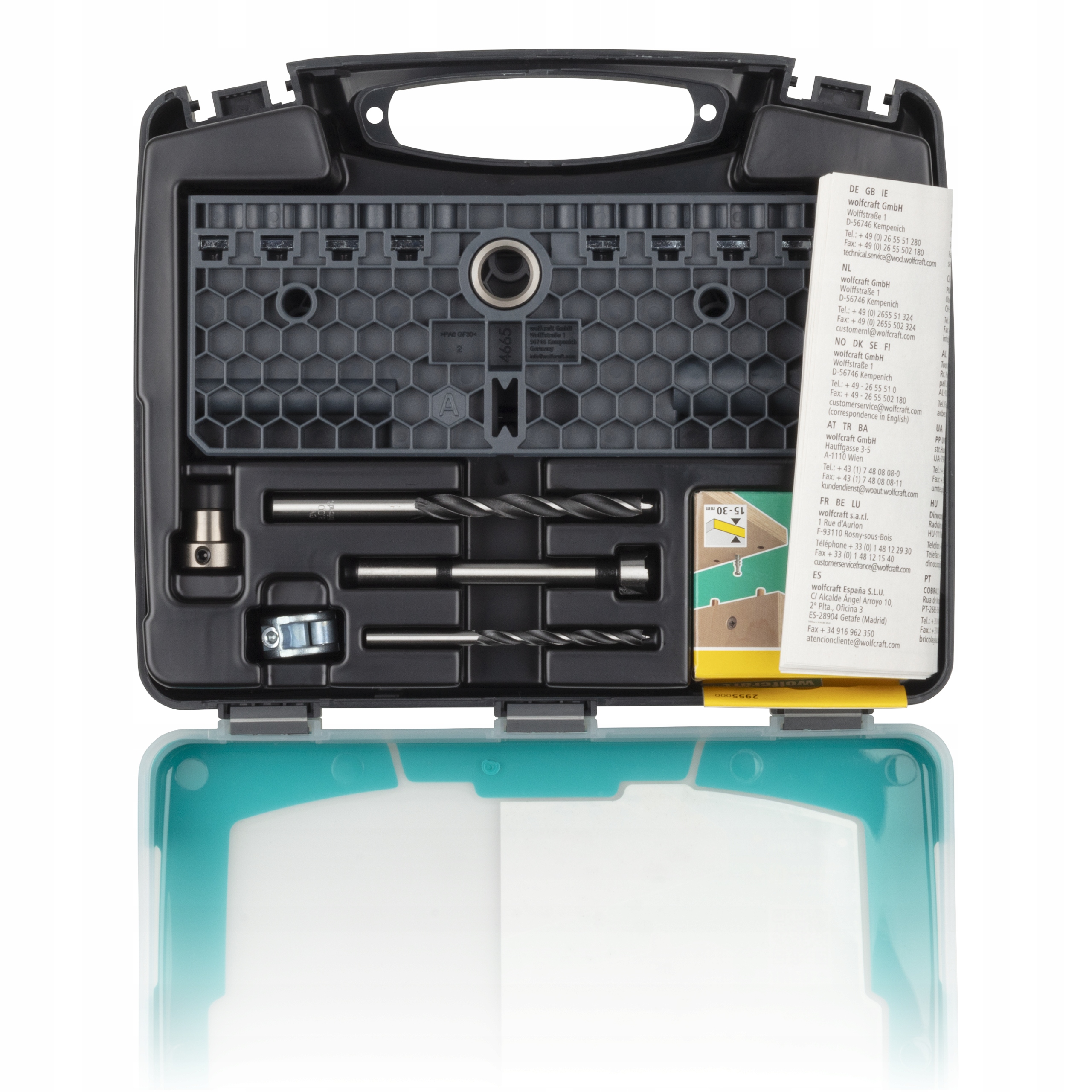 - Практический чемодан содержит двухэтажный шаблон бурения из высококачественного пластика и все необходимые учения для бурения с ограничением глубины. Набор также включает в себя мебельные разъемы и дюбели в сумме, достаточном для создания корпуса мебели.