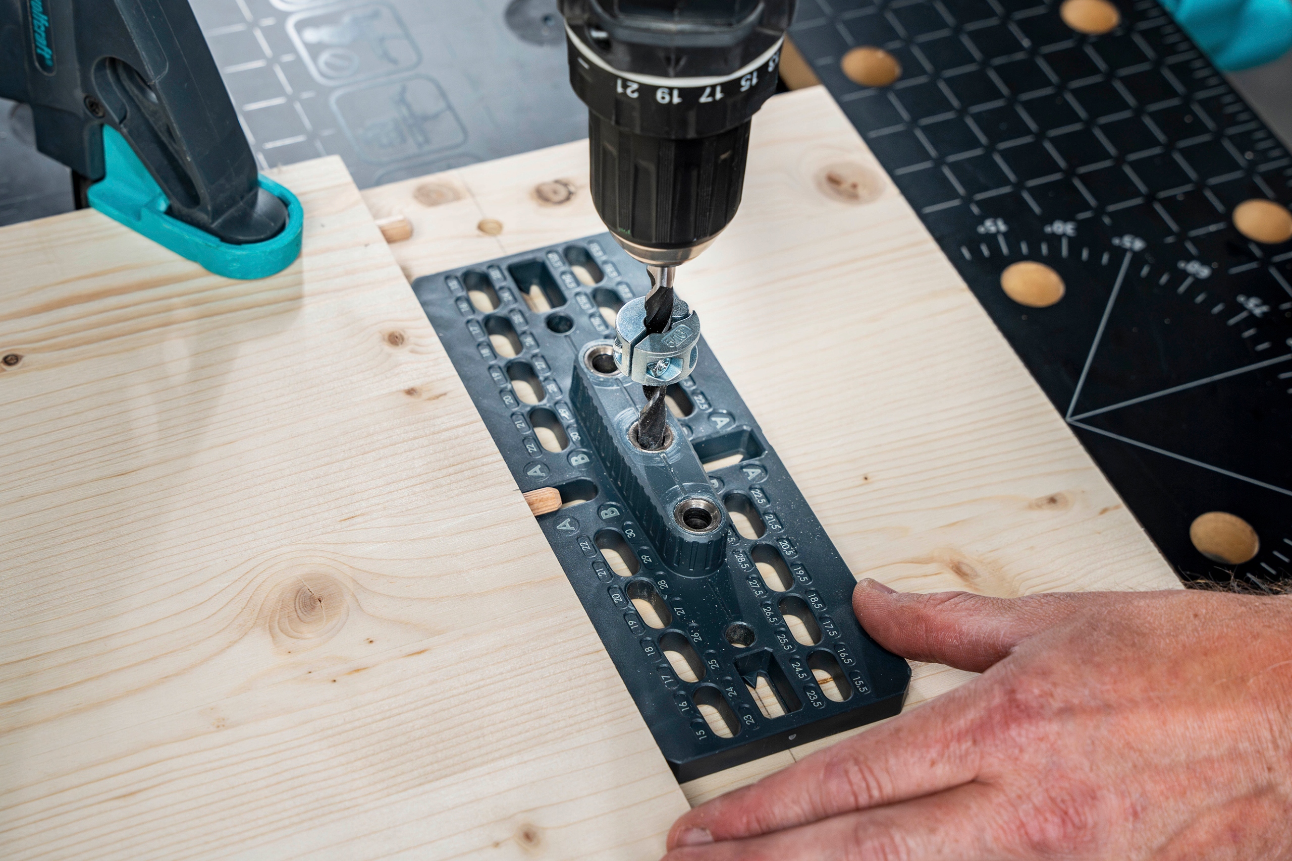 - Связь между деревянными элементами создается с использованием эксцентричных раковин, эксцентриков и деревянных дюбелей. Двухпартийный шаблон бурения используется для определения правильных положений отверстий и глубины бурения, которые затем просверлены в комбинированных элементах мебели с сверлами, оборудованными ограничителями глубины. Шаблон бурения также имеет структуру отверстия со стандартным интервалом открытия 32 мм, который можно использовать для создания рядов отверстий, например, для полков.