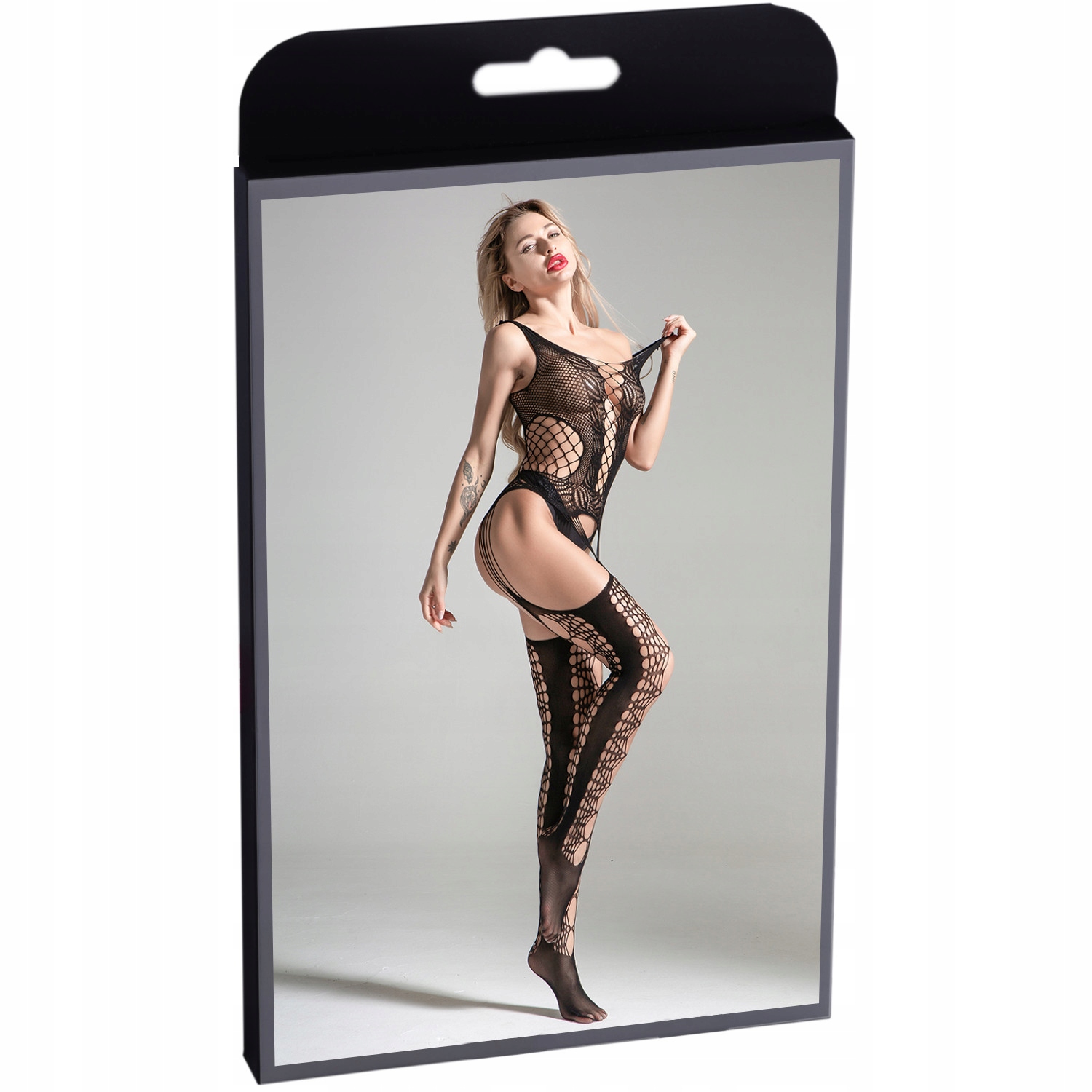 Комплект нижнего белья боди-стокинг в варианте боди в сочетании с чулками, впечатляющий оригинальным дизайном. Модель нижнего белья, которая выглядит идеально в любом варианте. Спереди и сзади имеется глубокий вырез, бретели состоят из интенсивно вырезанных полосок. Тонкие полоски также соединяют рубашку с чулками. Интересная темная строчка вокруг бюста и талии. Просто наденьте его и посмотрите, как быстро ваш партнер упадет к вашим ногам. Выглядит все это элегантно и чрезвычайно эффектно, нижнее белье можно носить отдельно или под одеждой – у него есть отверстие в промежности. Оригинальный узор позволяет замаскировать любые недостатки фигуры, а также задает четкие границы отдельных частей нижнего белья. В комплект боди входят стринги.
