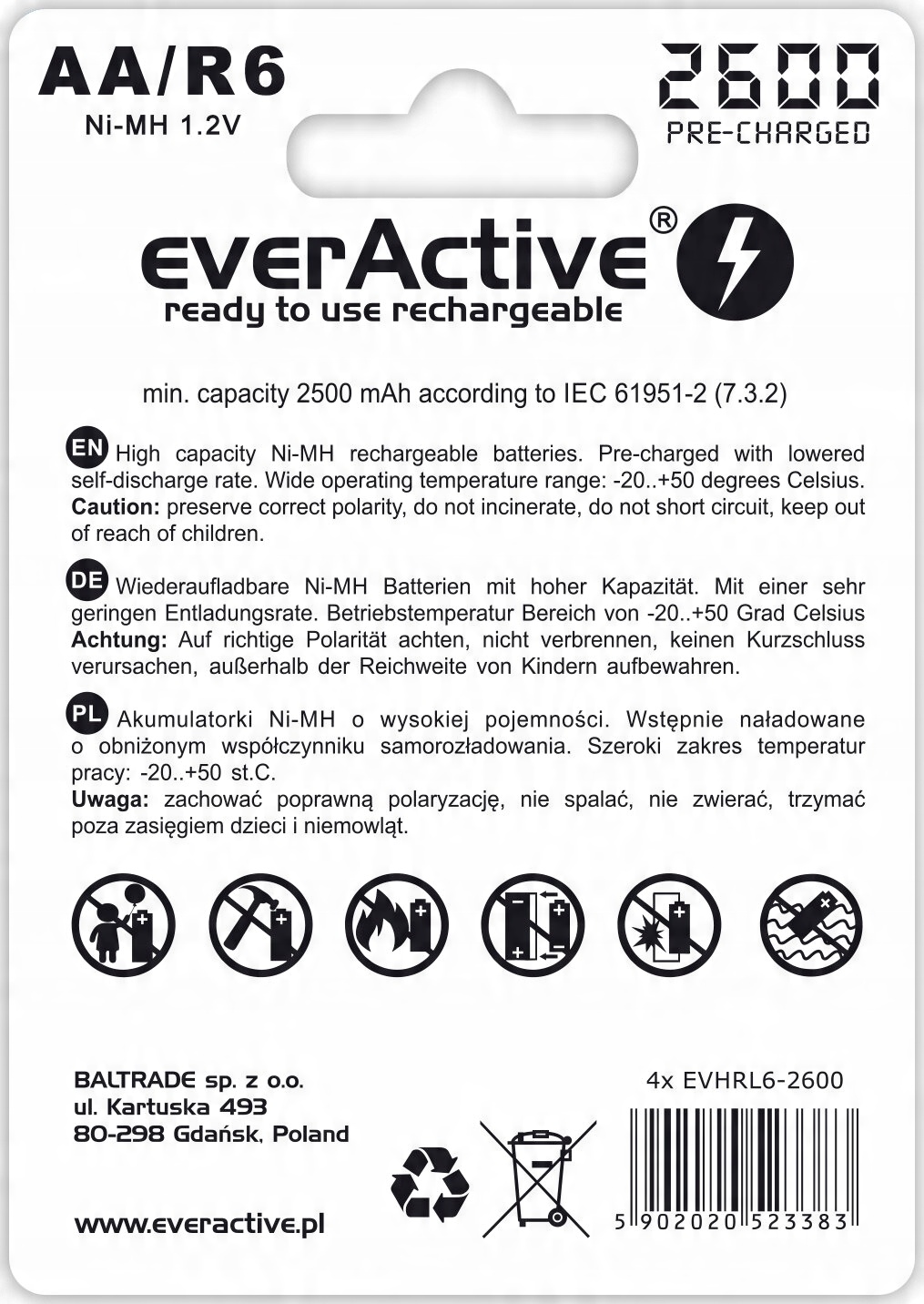 Эффективные аккумуляторы R6 AA от EverActive, полностью изготовленные по технологии «ready to use» (готовы к использованию сразу после извлечения из упаковки), имеют чрезвычайно высокую емкость (2600 мАч) они очень эффективны и характеризуются высокой повторяемостью параметров. Предлагаемые аккумуляторы также устойчивы к низким температурам – они легко сохраняют свои свойства в диапазоне от -20 до 50 градусов С.