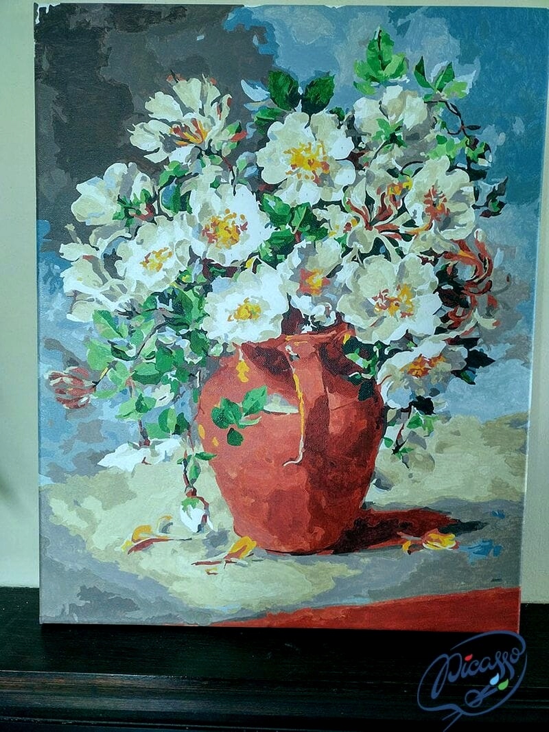 На холсте есть зоны с напечатанными на них номерами, которые необходимо закрасить краской с числовым присвоением.