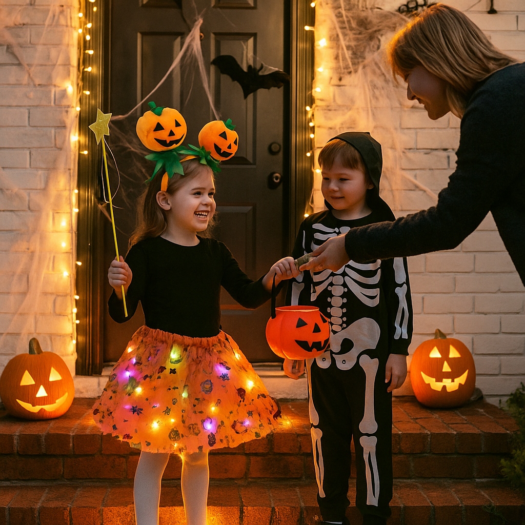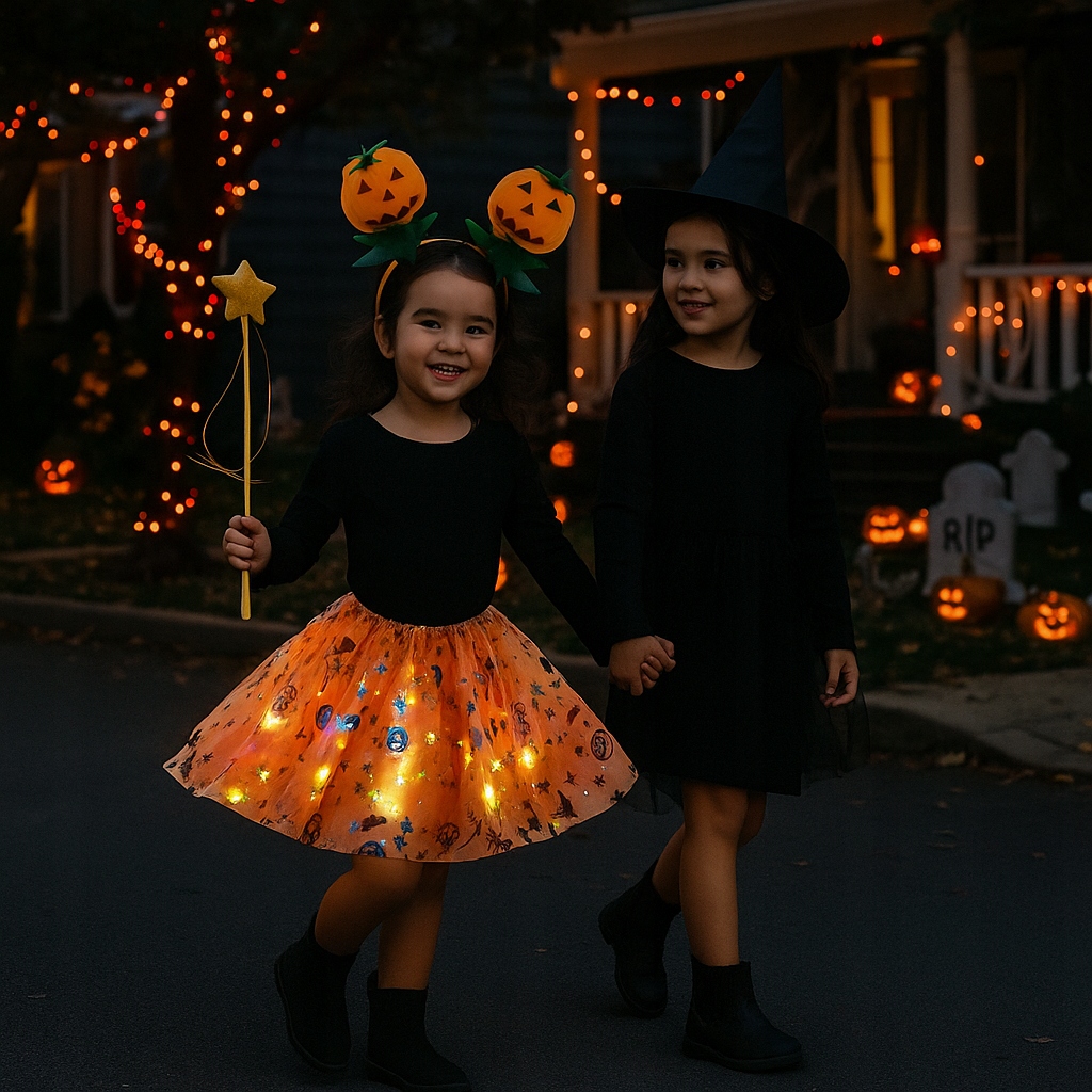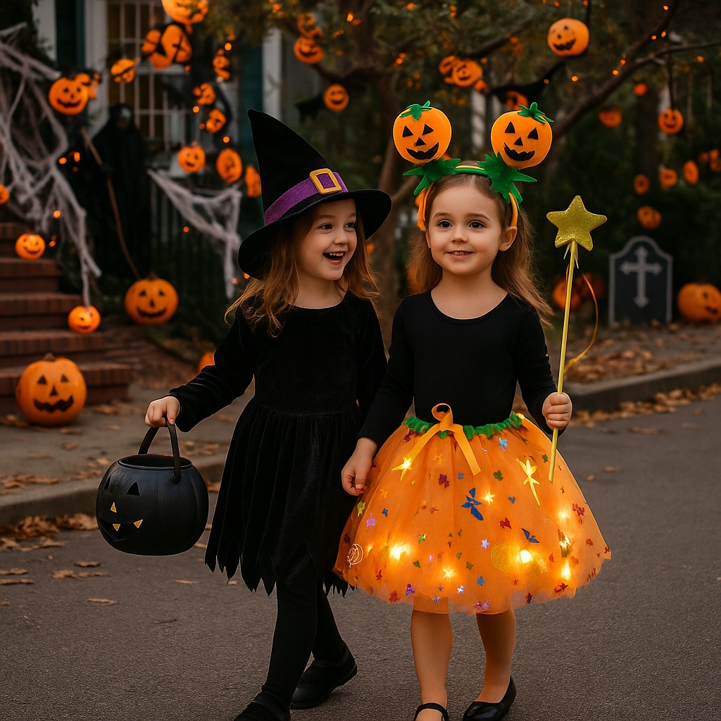<ул>✅ НАБОР «ХЭЛЛОУИН 4-в-1» – идеальный карнавальный костюм: юбка, повязка на голову, палочка, светодиодная гирлянда