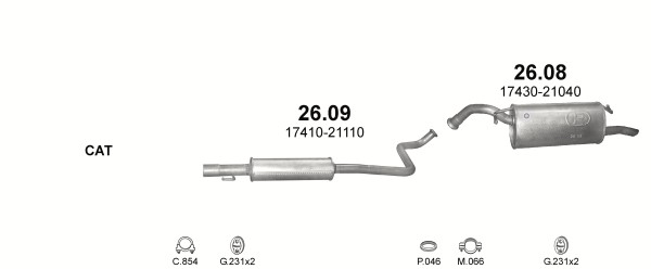 На данном аукционе продаю комплект глушителей (средний+концевой) №1. 26.08 + 26.09 для Toyota Yaris Verso в бензиновых двигателях мощностью 1,3–16 В, мощность 63 кВт/86 л.с., выпуска 1999–11/2002 г. + колпачок. Модели 1.5 мощностью 78 кВт/106 л.с. 1999 г. Дополнительно предлагаю монтажные аксессуары (хомуты, прокладки, резиновые подвески, монтажная паста). Этот глушитель изготовлен из листового металла, алюминизированного с обеих сторон, производства польского производителя Polmostrow, сертифицирован TUV и ISO 9001:2001 + Pimot, имеет звукоизоляцию на основе стекловолокна, сохраняющую заводской звук.