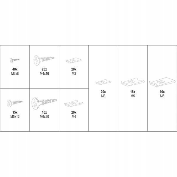 Описание: Набор из 170 винтов и шайб для корпуса. В комплект входят винты и шайбы размером от М3х8 мм до М6х20 мм. Все это было помещено в удобную упаковку типа «сортер».