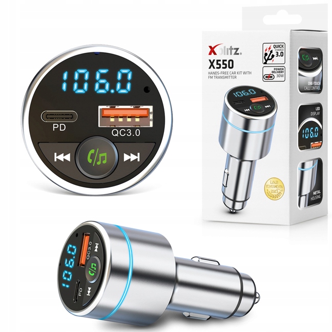 Xblitz X550 — это современный комплект громкой связи с FM-передатчиком, оснащенным технологией BT 5.3, и четким светодиодным дисплеем